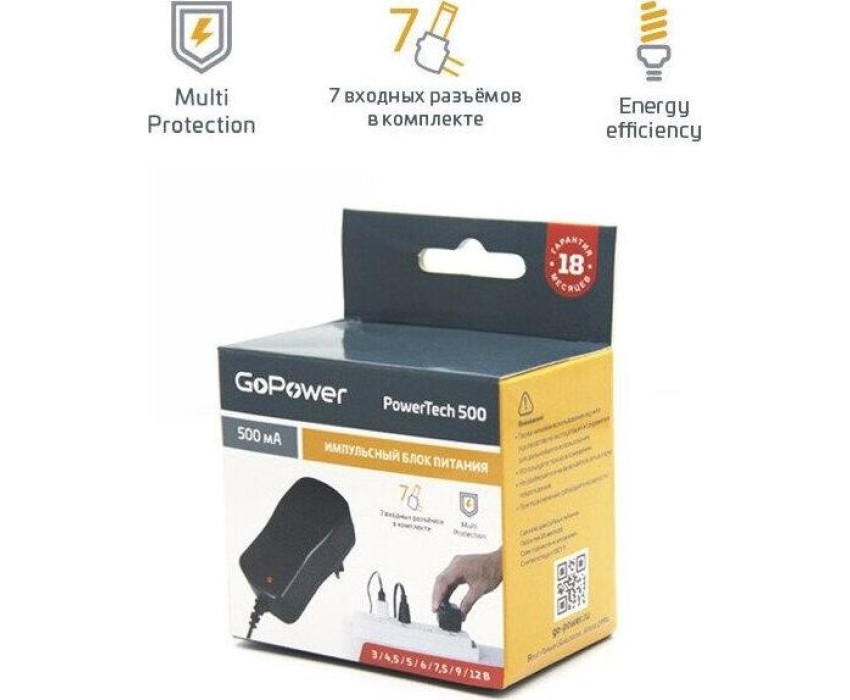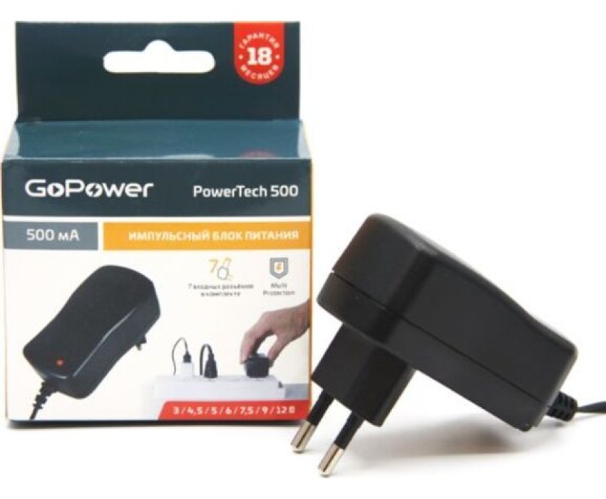 Универсальный импульсный блок питания 500мА. Выходное напряжение устанавливается переключателем: 3,0 / 4,5/ 5,0/ 6,0 / 7,5 / 9,0 / 12,0 В DC. Максимальный ток 500 мА. Штекеры: 7 штук - 5,0 х 2,1мм, 5,5 х 2,5 мм, 4,0 х 1,7 мм, 2,35 х 0,75 мм, 3,5 х1,35 мм, 2,5/12мм, 3,5/15мм. Технология «Multi Protection»: защита от короткого замыкания и перегрузок. Светодиодная индикация.