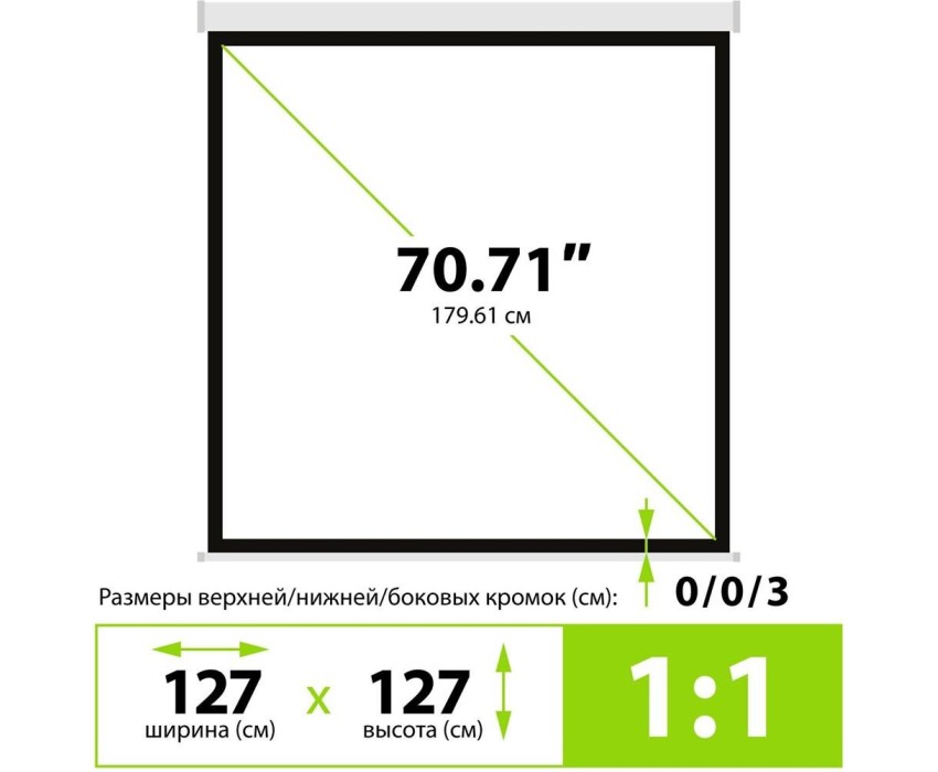 Тип установки: настенно-потолочный. Тип по конструкции: рулонный. Эффективный угол обзора: 160. Особенности покрытия: белый матовый. Вес товара: 5.3. Диагональ экрана: 70.71. Формат экрана: 1:1. Тип проекции: прямая. Цвет корпуса: белый. Размер белого поля полотна (см): 127x127. Коэффициент усиления: 1. Габариты упаковки (ед) ДхШхВ: 1.47x0.121x0.14. Вес упаковки (ед): 12. Гарантия: 12 мес.. Размеры экрана (ШхВ): 127х127 см. Размер корпуса экрана: 145.9x6.2x8 см. Экран: 70.71 ", 1:1, 127х127 см, рулонный. Коэффициент усиления: 1. Угол обзора: эффективный 160 °. Тип установки: настенно-потолочный. Тип проекции: прямая
