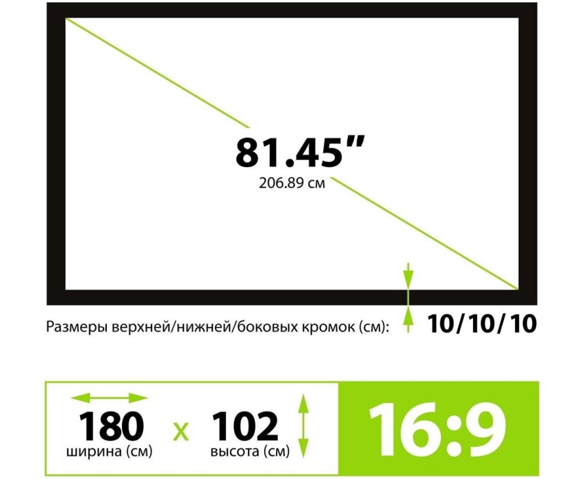 Тип установки: настенный. Тип по конструкции: натяжной. Конструкция крепления: рама. Эффективный угол обзора: 160. Особенности покрытия: белый матовый. Вес товара: 22.06. Диагональ экрана: 81.45. Формат экрана: 16:9. Тип проекции: прямая. Размер белого поля полотна (см): 180 x 101.3. Коэффициент усиления: 0.9. Габариты упаковки (ед) ДхШхВ: 2.081x0.28x0.18. Вес упаковки (ед): 18. Гарантия: 12 мес.. Размеры экрана (ШхВ): 180х102 см. Размеры черной кромки: 3 см. Размер корпуса экрана: 200x121x4 см. Коэффициент усиления: 0.9. Тип проекции: прямая. Угол обзора: эффективный 160 °. Тип установки: настенный. Экран: 81.45 ", 16:9, 180х102 см, натяжной