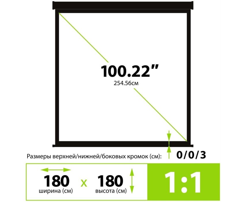 Тип установки: настенно-потолочный. Тип по конструкции: рулонный. Эффективный угол обзора: 160. Особенности покрытия: белый матовый. Механизм плавного возврата: есть. Вес товара: 7.45. Диагональ экрана: 100.22. Формат экрана: 1:1. Тип проекции: прямая. Цвет корпуса: черный. Коэффициент усиления: 1. Габариты упаковки (ед) ДхШхВ: 2.011x0.15x0.121. Вес упаковки (ед): 8.8. Гарантия: 12 мес.. Размеры экрана (ШхВ): 180х180 см. Размер корпуса экрана: 198.9x6.2x9 см. Угол обзора: эффективный 160 °. Экран: 100.22 ", 1:1, 180х180 см, рулонный. Тип проекции: прямая. Тип установки: настенно-потолочный. Коэффициент усиления: 1. Особенности: механизм плавного возврата