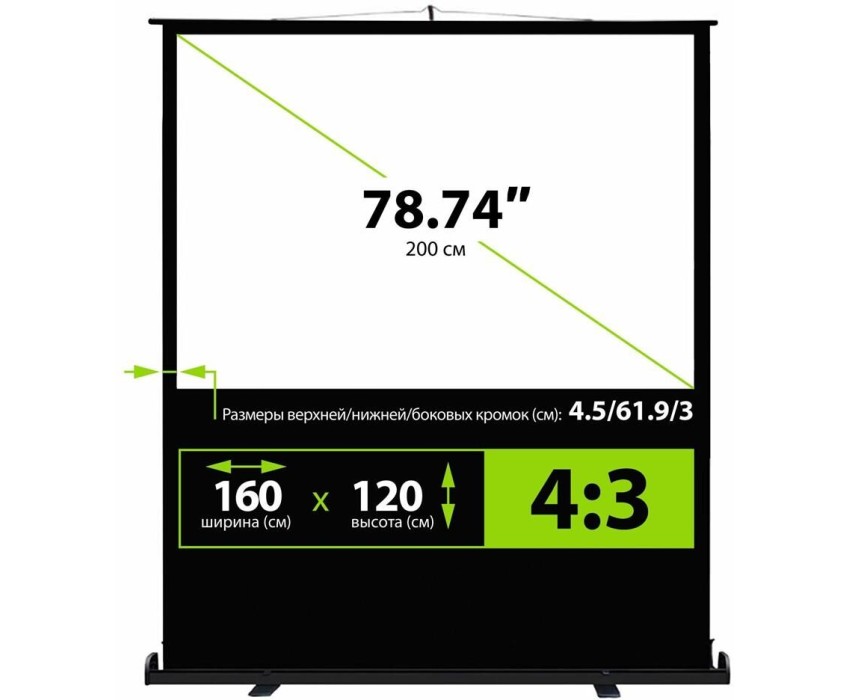 Тип установки: напольный. Тип по конструкции: рулонный. Эффективный угол обзора: 160. Особенности покрытия: белый матовый. Вес товара: 11. Диагональ экрана: 78.74. Формат экрана: 4:3. Тип проекции: прямая. Размер белого поля полотна (см): 154 x 115.5. Коэффициент усиления: 1. Габариты упаковки (ед) ДхШхВ: 1.85x0.18x0.16. Вес упаковки (ед): 10. Гарантия: 12 мес.. Размеры экрана (ШхВ): 160х120 см. Размеры черной кромки: 3 см. Размер корпуса экрана: 175.7x13.2x13 см. Коэффициент усиления: 1. Тип установки: напольный. Экран: 78.74 ", 4:3, 160х120 см, рулонный. Тип проекции: прямая. Угол обзора: эффективный 160 °