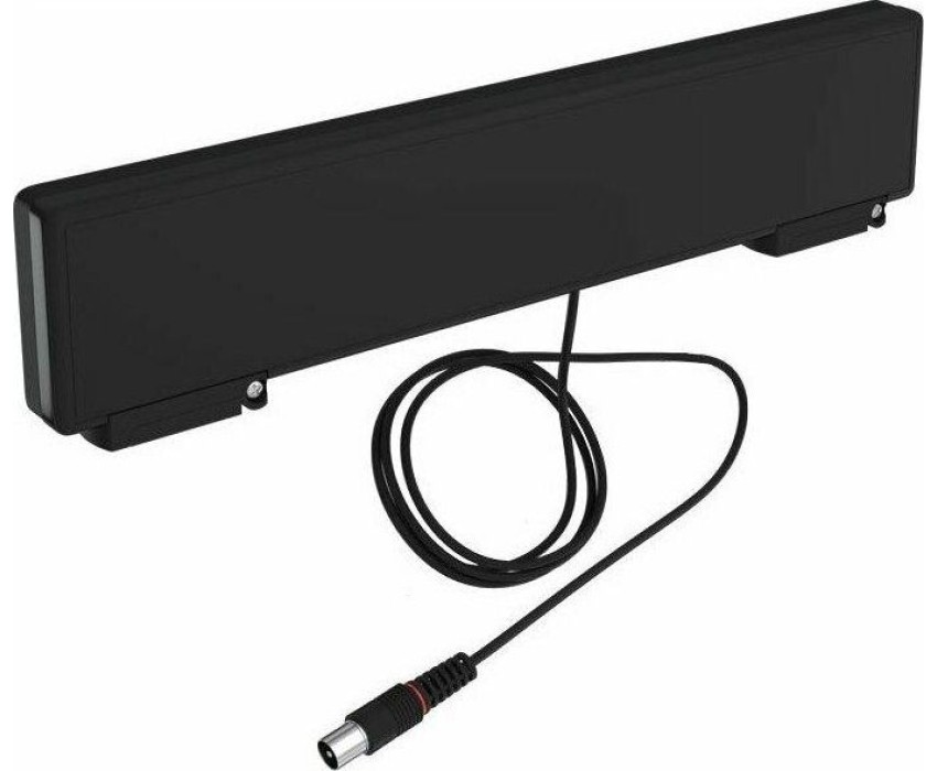 Комнатная цифровая активная антенна, питание от TV или ресивера, коэффициент усиления 35дБи, волновое сопротивление 75 Ом, длина кабеля 1,2 м, размер 315х75х32 мм, масса 0,23 кг.