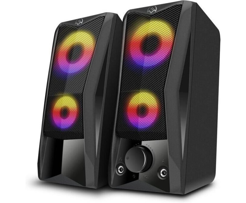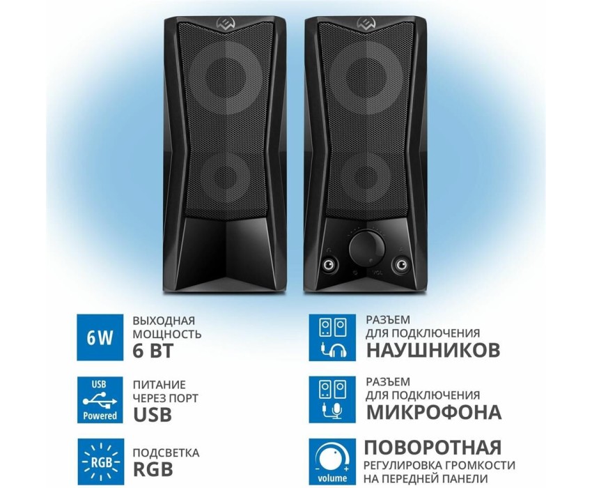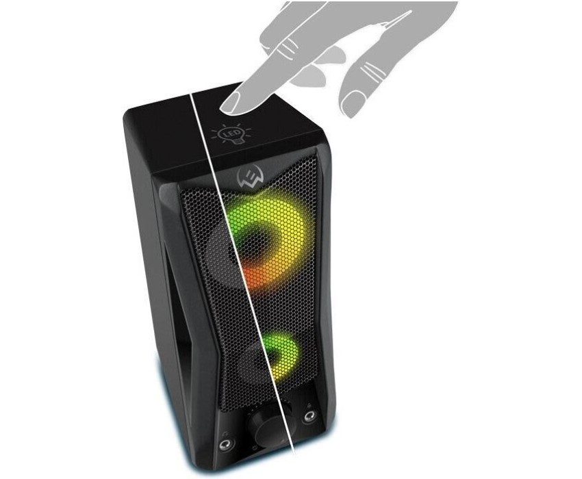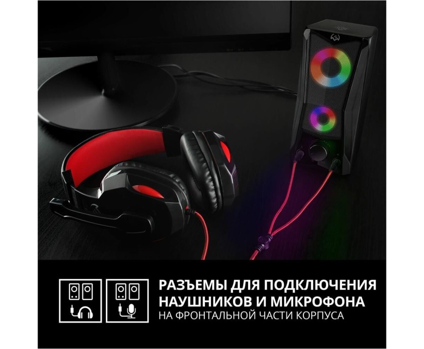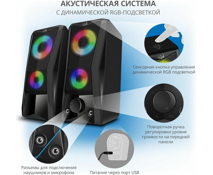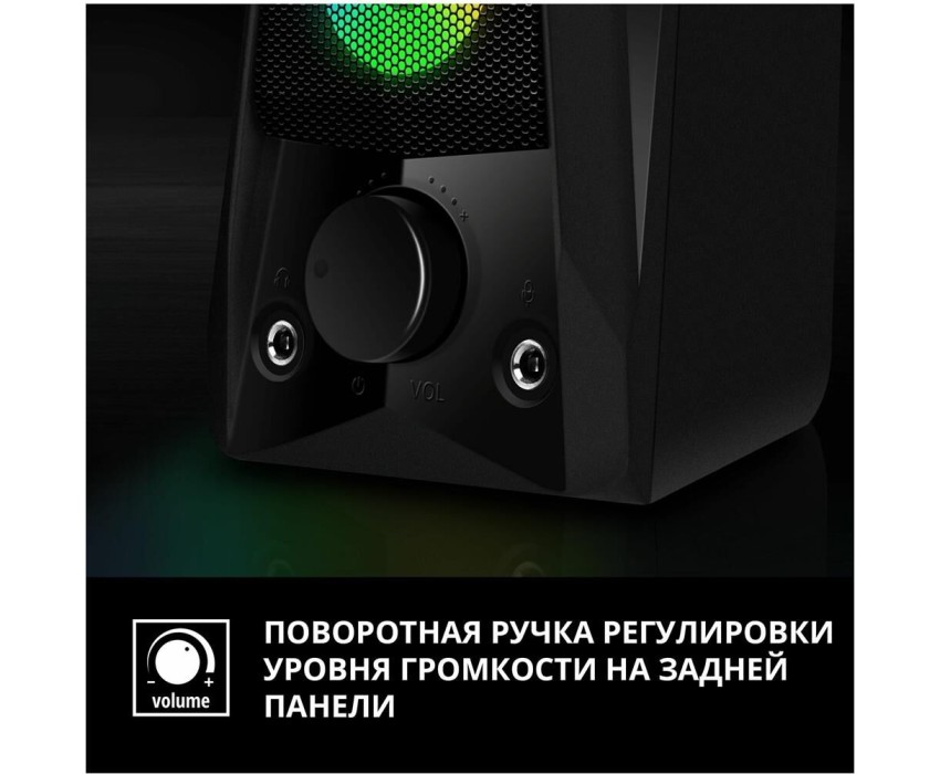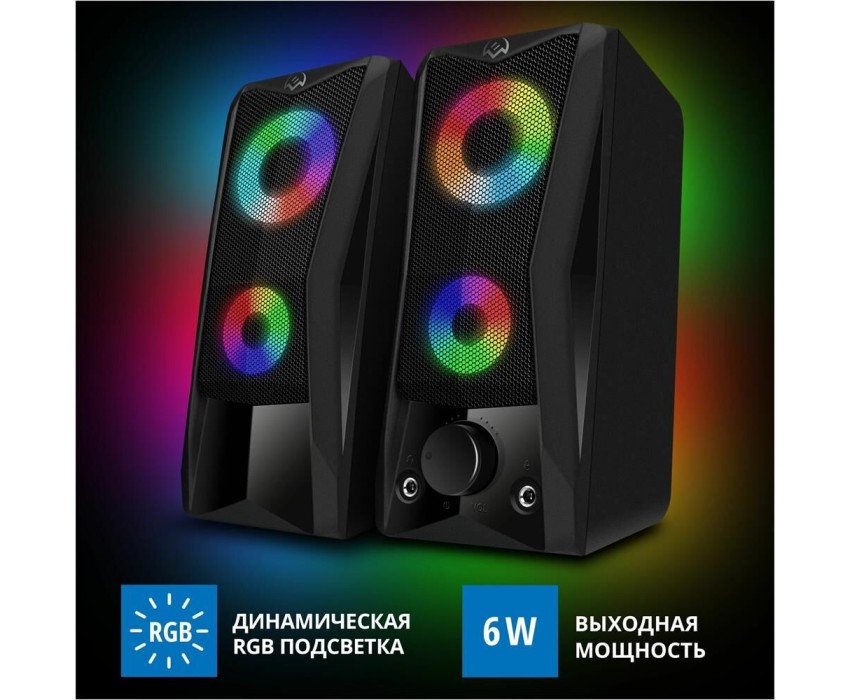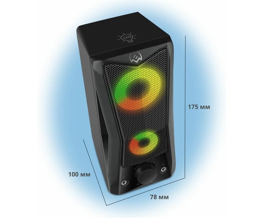 Эти динамики не только дают мощный звук, они взрываются цветом! Разноцветная светодиодная динамическая подсветка в сочетании с матово-черным корпусом отлично вписывается в любую конфигурацию игровой станции. На передней панели каждой колонки находятся два переливающихся светящихся круга. Подсветку можно выключить с помощью сенсора на верхней панели. Звуки игрового мира в сочетании со световыми эффектами мгновенно изолируют вас от реальности. Вы гарантированно получите весь спектр впечатлений! Выходная мощность (RMS): 6 Вт. Частотный диапазон: 90 – 20 000 Гц. Размеры динамиков: 65 мм. Напряжение питания: USB/DC 5V. Материал корпуса: ABS-пластик. Размеры изделия: 78*175*100 мм. Вес: 750 г.