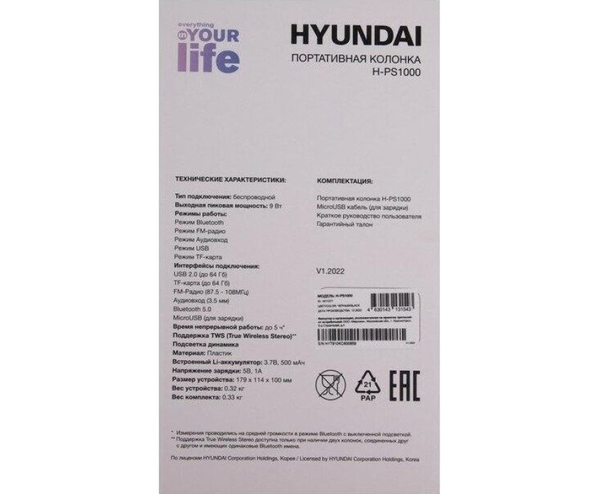 Брэнд: HYUNDAI Модель (колонки): H-PS1000 Интерфейс подключения: Bluetooth/USB Радиус действия Bluetooth, до: 10 м Акустический тип: 1.0 Суммарная звуковая мощность: 9 Вт Частотный диапазон: 20 Гц - 20000Гц Отношение сигнал/шум: 96 дБ Версия Bluetooth: v5.0 Встроенный радиоприемник: есть Диапазоны радиоприемника: FM Частоты FM-диапазона: 87.5-108 МГц Поддержка карт памяти: microSD Расположение регуляторов: на передней панели Разъем USB: 2.0 Стерео-вход AUX INPUT: есть Тип электропитания: от сети/от аккумулятора Емкость аккумулятора: 500 mAh Время работы: до 5 ч Время зарядки: 3 ч Наличие подсветки: ДА Тип подсветки: светодиодная Возможность одновременного подключения двух колонок: есть Материал корпуса: пластик Цвет: черный Размеры (ШхВхГ): 114 x 179 x 100 мм
