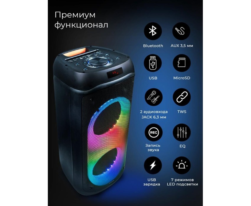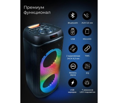 Суммарная звуковая мощность: 200. Цвет: черный. Акустический тип: 1.0. Тип электропитания: от сети/от аккумулятора. Поддержка карт памяти: есть. Тип карт памяти: microSD. Интерфейс подключения: Bluetooth/3.5Jack/USB. Емкость аккумулятора: 4400. Батерейки в комплекте: без батареек в комплекте. Стерео-вход AUX INPUT: есть. Отношение сигнал/шум: 70. Расположение регуляторов: на верхней панели/ на пульте ДУ. Особенности: Многоцветная подсветка и пульт ДУ. Версия Bluetooth: v5.0. Тип аккумулятора: Li-Ion. Время работы: 6. Время зарядки: 2.5. Вес: 8100. Наличие подсветки: ДА. Тип подсветки: RGB. Возможность одновременного подключения двух колонок: есть. Дисплей: есть. Комплектация: Колонка, Адаптер питания, Аудио кабель, Пульт ДУ, Руководство пользователя. Материал корпуса: пластик. Габариты упаковки (ед) ДхШхВ: 0.385x0.375x0.78. Вес упаковки (ед): 9.62. Страна производства: Китай. Гарантия: 12 мес.. Частотный диапазон: 40 Гц - 20кГц. Размеры (ШхВхГ): 320 x 725 x 330 мм. Особенности: поддержка карт памяти. Акустический тип: 1.0. Подключение: Bluetooth/3.5Jack/USB. Мощность: 200 Вт