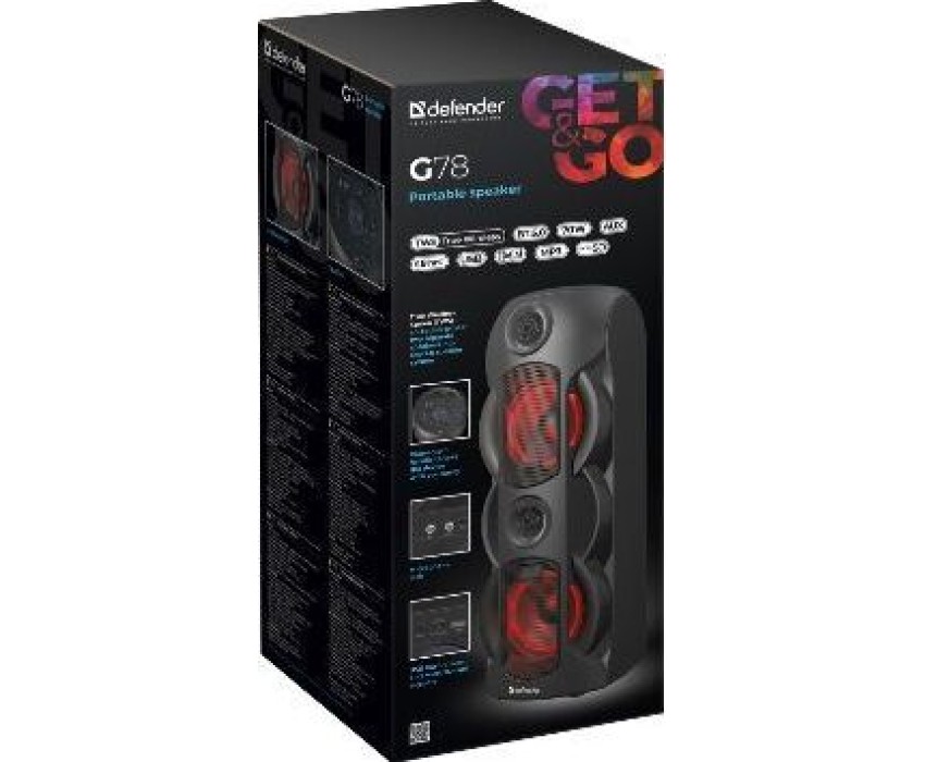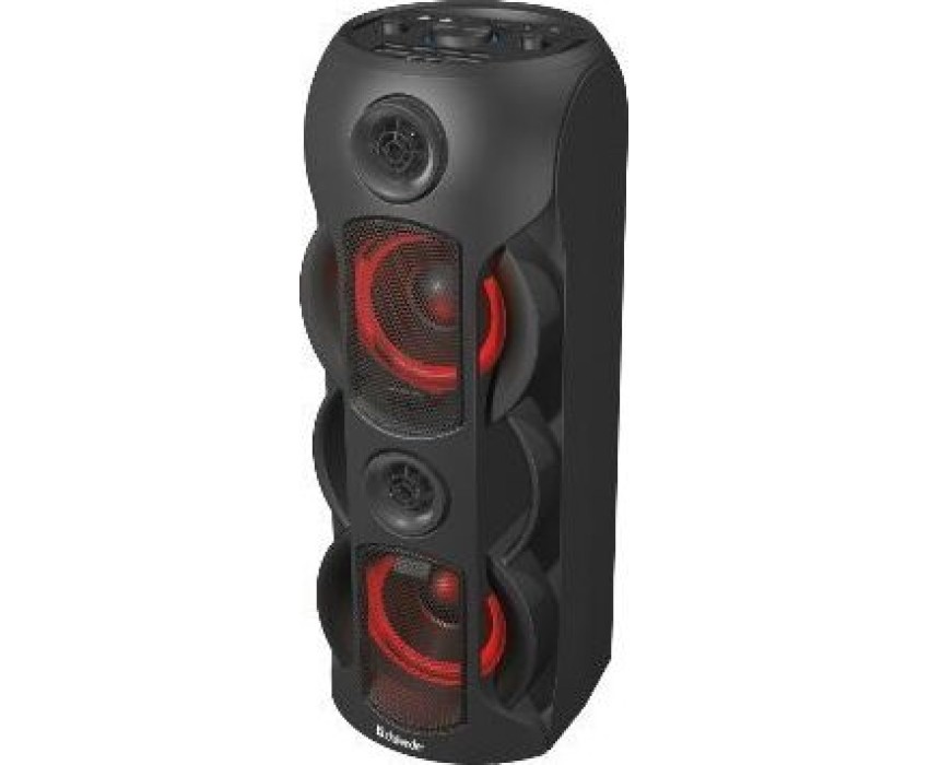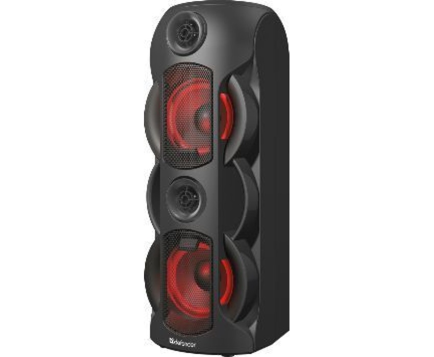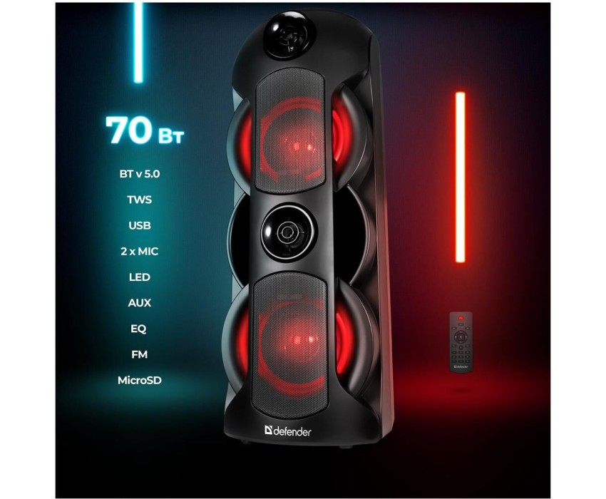 Акуститическая система, Bluetooth 5.0, звуковая схема 2.0, суммарная выходная мощность (RMS)- 70 Вт, диапазон частот - 40–20000 Гц, емкость аккумулятора - 4400 мА·ч, True Wireless Stereo (TWS) — возможность сопряжения двух отдельных колонок по Bluetooth в акустическую 2.0 систему, встроенный FM-приемник, светодионая подсветка, встроенный MP3-плеер, поддержка USB-накопителей и MicroSD-карт, дополнительный AUX-аудиовход, эквалайзер, вход для микрофона - 6,3-мм джек, пулт ДУ, габаритные размеры 25,0 x 64,0 x 23,0 см.