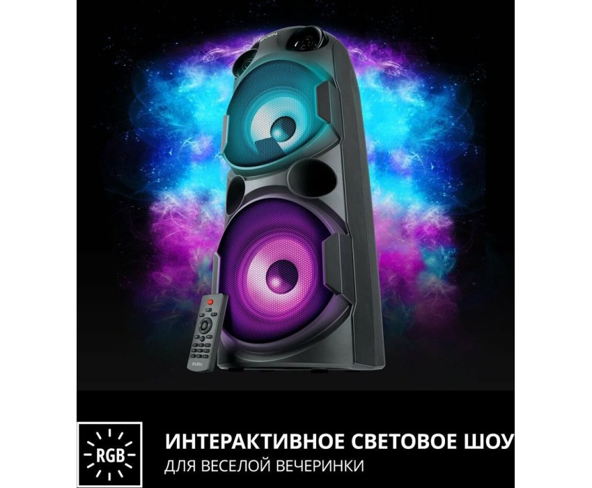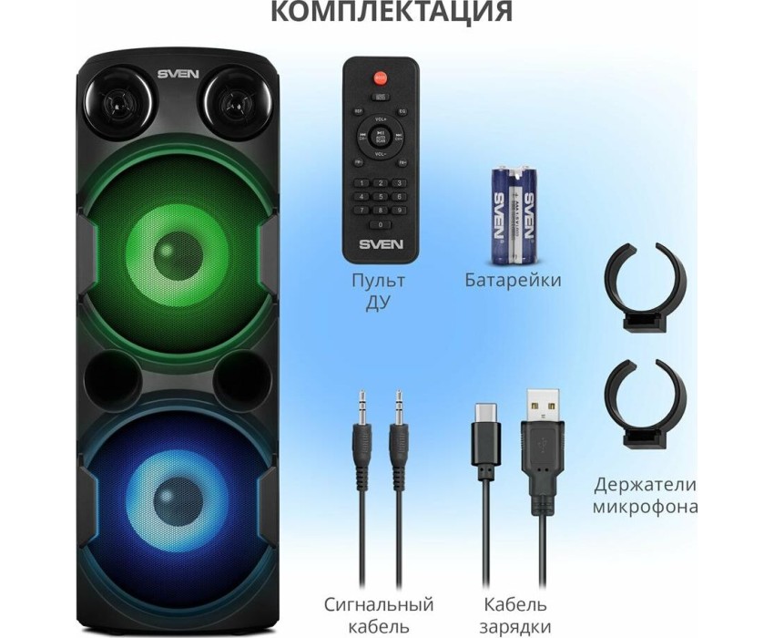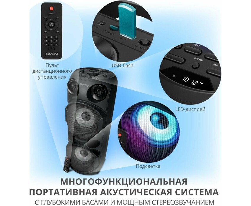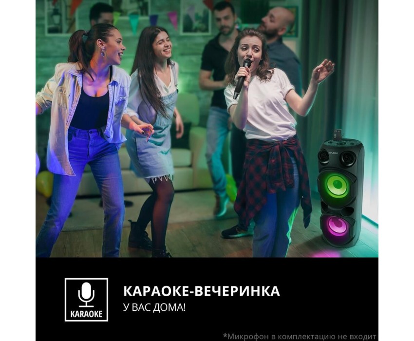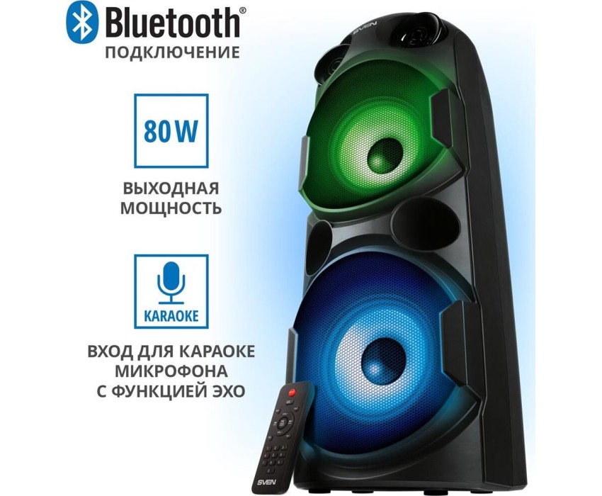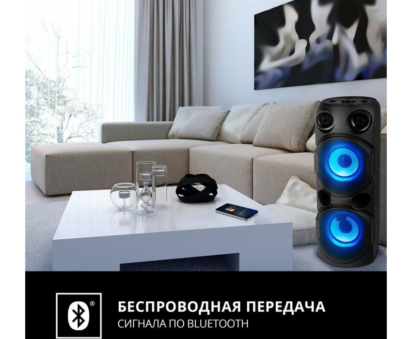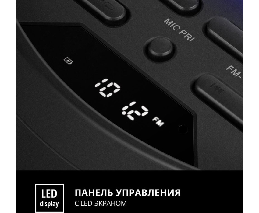 домашняя аудиосистема, система All-in-One, Основной цвет черный, Формат акустической системы 1.0, Мощность 80 Вт, Количество полос фронтальной акустики 2, Частотный диапазон 45 Гц - 22 кГц, Материал корпуса акустики пластик, Тип проигрывателя USB, Воспроизведение с USB накопителей, Поддерживаемые форматы WMA , MP3 , WAV , FLAC, Радиоприемник FM (87.5 - 108 МГц), Дисплей, Караоке, Регулировки- громкость эха , громкости микрофона , эквалайзер, LED подсветка колонок, Тип проводного соединения 3.5 jack , 6.3 jack, Беспроводные интерфейсы Bluetooth, вход для микрофона х 2, Устройство для чтения карт памяти SD, Питание от аккумулятора, Ёмкость встроенной батареи 8800 мА*ч, Напряжение питания 5В, Комплектация FM-антенна , пульт ДУ , документация , кабель питания, режим TWS , диаметр НЧ динамика 145 мм , диаметр ВЧ динамика 32 мм, ширина основного блока 230 мм, Высота основного блока 640 мм, Глубина основного блока 260 мм, Общий вес 5.2 кг