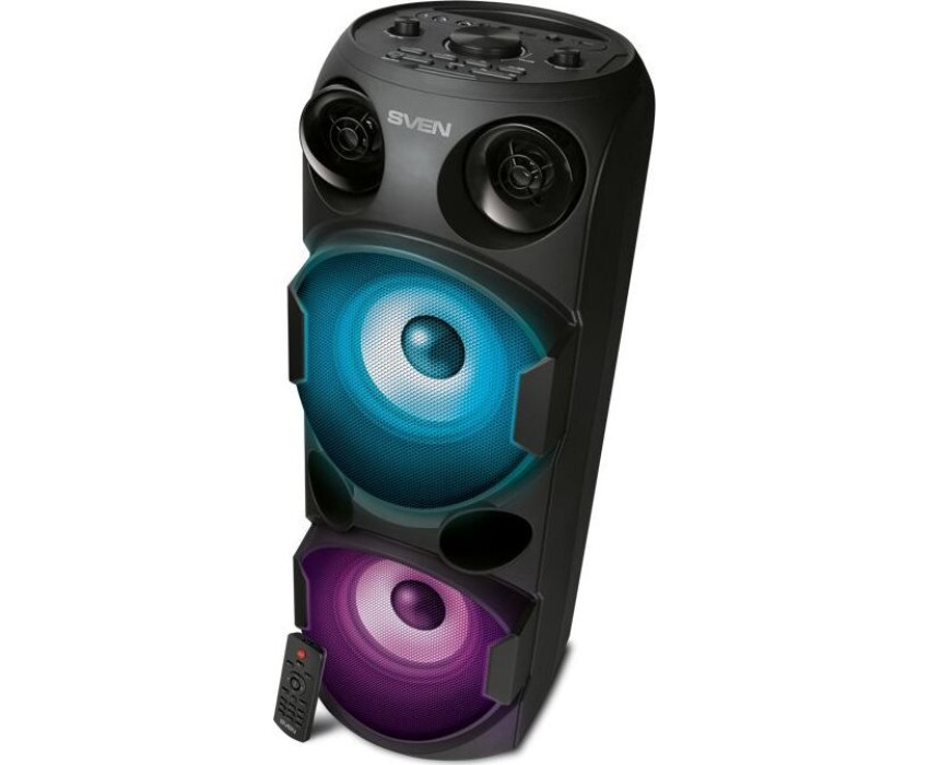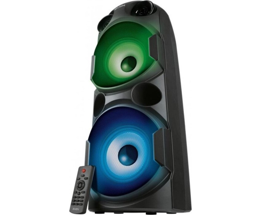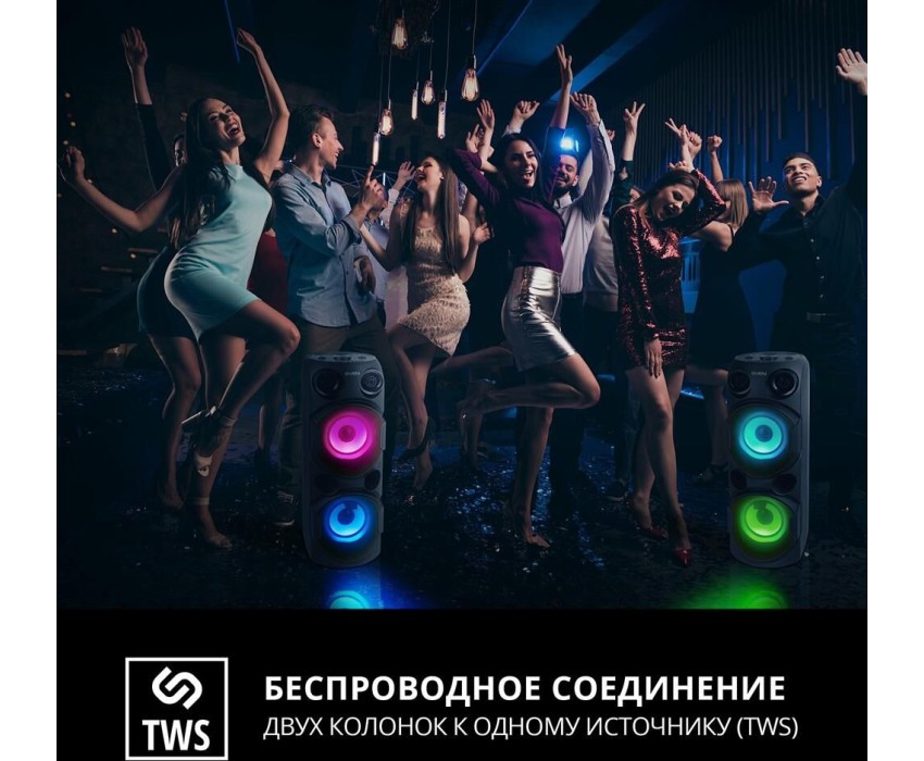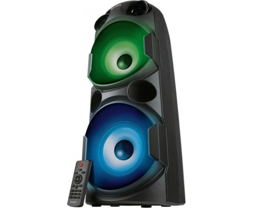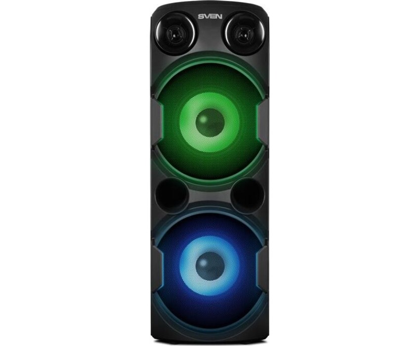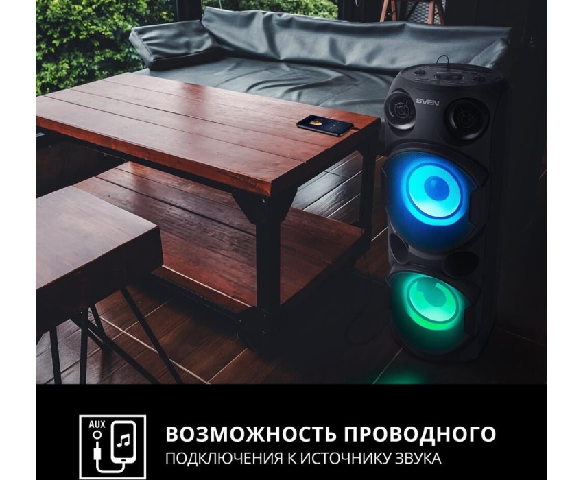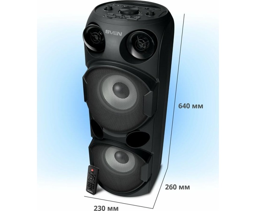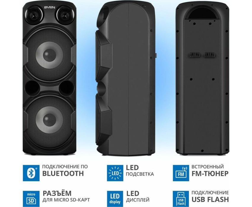 домашняя аудиосистема, система All-in-One, Основной цвет черный, Формат акустической системы 1.0, Мощность 80 Вт, Количество полос фронтальной акустики 2, Частотный диапазон 45 Гц - 22 кГц, Материал корпуса акустики пластик, Тип проигрывателя USB, Воспроизведение с USB накопителей, Поддерживаемые форматы WMA , MP3 , WAV , FLAC, Радиоприемник FM (87.5 - 108 МГц), Дисплей, Караоке, Регулировки- громкость эха , громкости микрофона , эквалайзер, LED подсветка колонок, Тип проводного соединения 3.5 jack , 6.3 jack, Беспроводные интерфейсы Bluetooth, вход для микрофона х 2, Устройство для чтения карт памяти SD, Питание от аккумулятора, Ёмкость встроенной батареи 8800 мА*ч, Напряжение питания 5В, Комплектация FM-антенна , пульт ДУ , документация , кабель питания, режим TWS , диаметр НЧ динамика 145 мм , диаметр ВЧ динамика 32 мм, ширина основного блока 230 мм, Высота основного блока 640 мм, Глубина основного блока 260 мм, Общий вес 5.2 кг