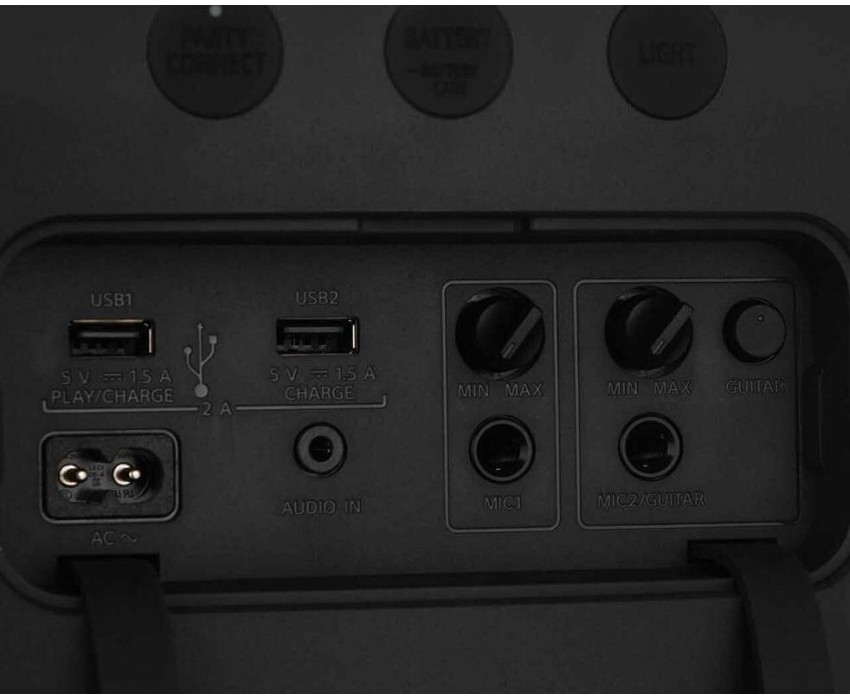 Общая выходная мощность 100 Вт. Диапазон частот 20-2000 Гц. Количество динамиков 6. Количество ВЧ-динамиков 3 передних, 1 задний. Диаметр ВЧ-динамика 60 мм, задний 50 мм. Количество НЧ-динамиков 2. Диаметр НЧ-динамика 170 мм. Тип управление электронное. Управление c мобильного устройства да. Поддержка мобильного приложения Sony Music Center. Порт USB 2.0 2. Вход для микрофона 3.5 мм 1. Разъем для микрофона 6.3 мм 1. Порт RCA 1. Поддержка Bluetooth да. Версия Bluetooth 5.0. Профиль A2DP да. Профиль AVRCP да. Радиус действия 30 м. Питание от сети. Тип элементов питания собственный аккумулятор. Время работы в режиме музыки 25 ч. Время зарядки 3 ч.