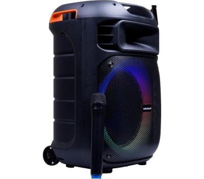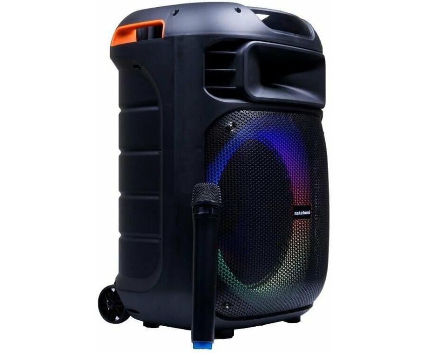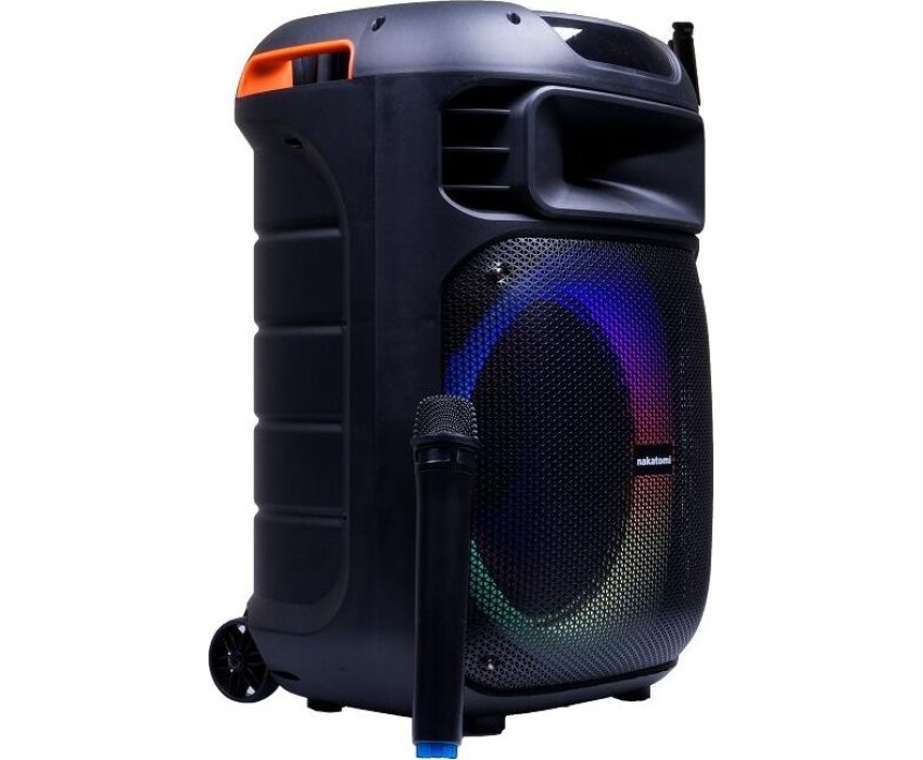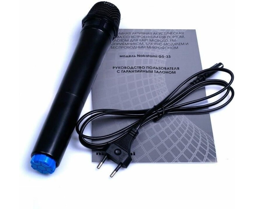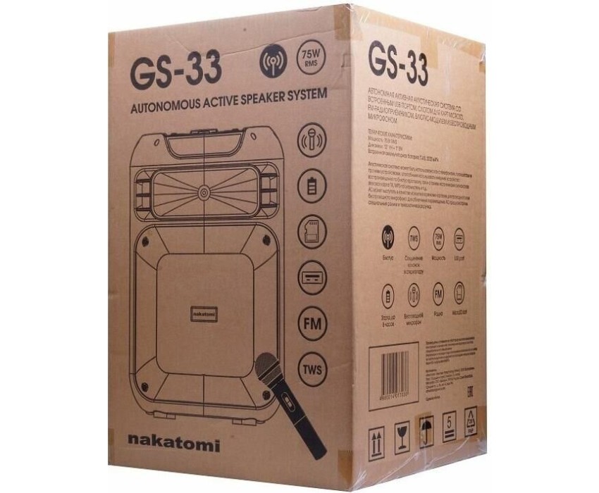 Nakatomi GS-33 – напольная переносная акустическая колонка 1.0 (моно) Мощность RMS (Вт) 75 Bluetooth v.5.0 Поддержка режима TWS Li-Ion аккумулятор 3600 мА*ч, 7.4В Поддержка USB, MicroSD до 32Гб, форматы файлов MP3 с битрейтом 64-320 Кбит/с, FLAC, WAV, WMA FM-радиоприемник Входы AUX Line-in (миниджек 3.5 мм) Караоке: да, 2 разъема для подключения микрофона, 1 беспроводной микрофон в комплекте Усилитель встроенный ИК пульт, 33 кнопки, питание от двух батареек типа ААА Динамическая многоцветная цветомузыка на фронтальной панели. Динамик(и) НЧ/СЧ 12″ + ВЧ 1″ Сопротивление (Ом) 4 Частотный диапазон (Гц-КГц) 60-18 Корпус пластик Комплект поставки: акустическая система - 1 шт, беспроводной микрофон - 1 шт, ИК пульт ДУ - 1 шт, батарейки ААА для пульта ДУ - 2 шт, батарейки АА для беспроводного микрофона - 2 шт, адаптер питания - 1 шт, руководство пользователя с гарантийным талоном - 1 шт, упаковка - 1 шт