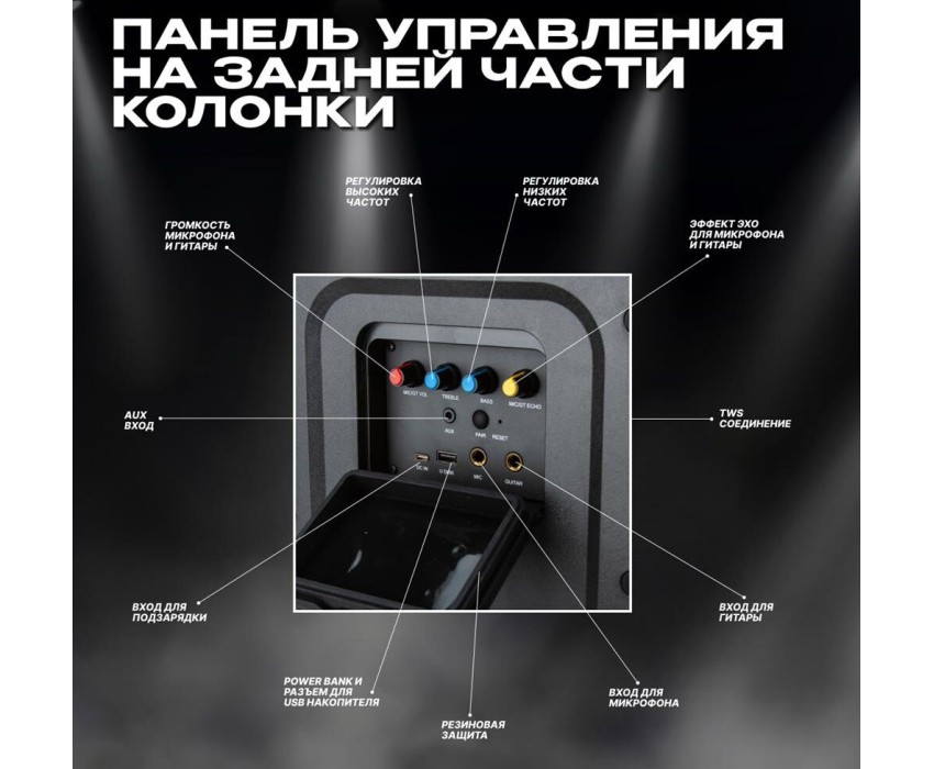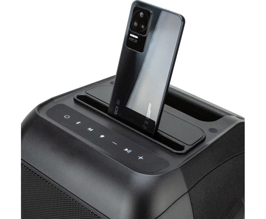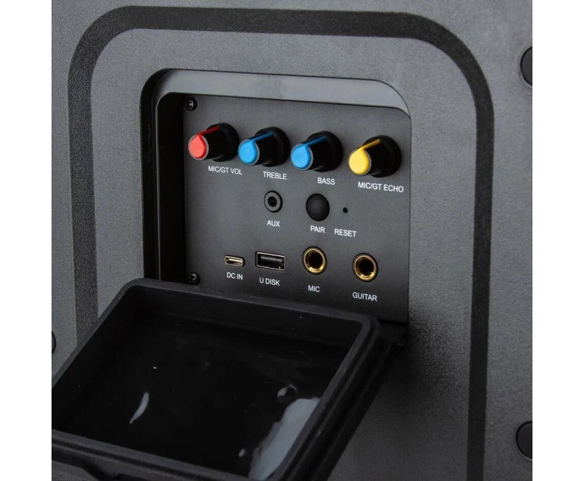 "Режимы воспроизведения: - Bluetooth - Внешний накопитель - Aux Мощность: - RMS 120 Ватт - PMPO 1200 Ватт Питание: - 5V/2A USB-C - Встроенный аккумулятор 11.1V / 4А (до 5 часов работы) Разъемы: - USB - AUX - Jack 6.3 мм (микрофон-гитара)-2 шт. Комплектация: - Колонка - Кабель питания - Микрофон беспроводной-1 шт - Инструкция Размер упаковки: Ширина - 60 см Высота - 37 см Глубина - 33 см Вес- 8,76 кг Дополнительно: LED подсветка Регулировка громкости микрофона Удобная ручка для переноски Защита от брызг ipx5"