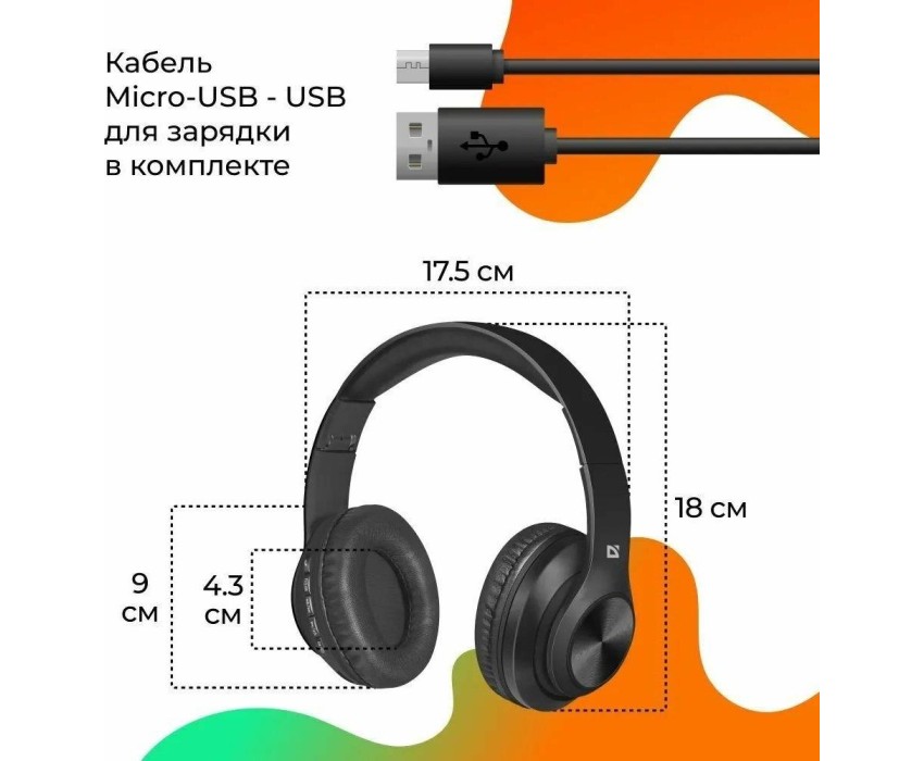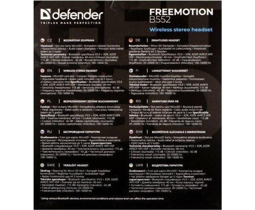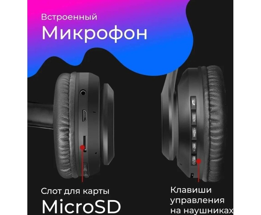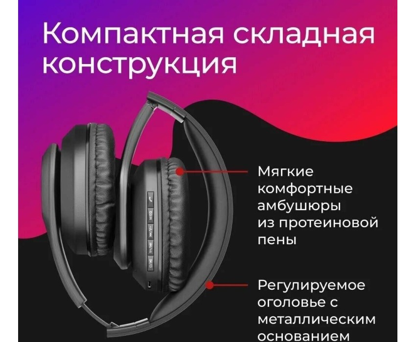 Гарнитура беспроводная, Bluetooth, чувствительность (наушники) - 115 дБ, чувствительность (микрофон) -42 дБ, частотный диапазон (наушники) - 20–20000 Гц, частотный диапазон (микрофон) - 100–16000 Гц, емкость аккумулятора - 200 мА·ч, время работы в режиме разговора / прослушивания музыки - 10 час, разъемы Micro-USB для зарядки батареи, встроенный микрофон, слот для карты MicroSD, встроенный FM-приемник, клавиши управления на наушниках, регулируемое оголовье, складная конструкция, радиус действия - 10 м.