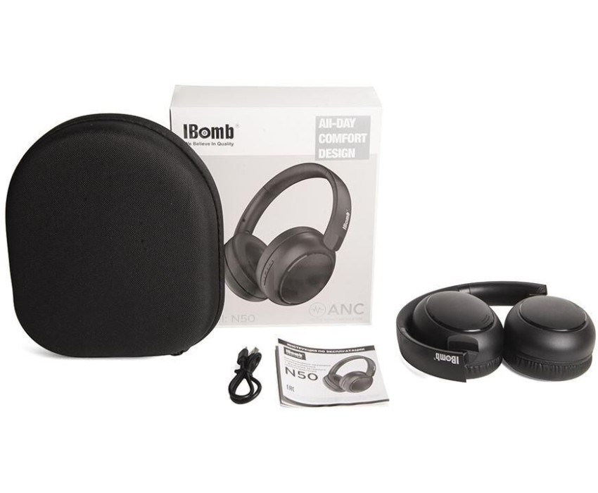 Беспроводные полноразмерные наушники IBomb N50 - это качественный товар для любителей хорошего звука. Ёмкий аккумулятор в 400мАч обеспечивает около 20 часов беспрерывной работы. Также IBomb N50 могут работать в проводном режиме через AUX-IN и поддерживают функцию гарнитуры. Это делает их универсальным помощником для прослушивания музыки с любых устройств. Одно из главных достоинств модели — активное шумоподавление (ANC). Полноразмерные наушники снижают уровень окружающего шума низкой и средней частоты на 92%. Вам остается только чистый звук и возможность получить удовольствие от прослушивания музыки, книги или общения без посторонних шумов. Включается шумоподавление кнопкой на корпусе наушников. Еще одно преимущество IBomb N50 - это высокая верность звучания (звук в формате Hi-Fi). Устройство направленно на то, чтобы звуки звучали максимально точно и качественно. Наушники оснащены самой современной версией блютуз - Bluetooth 5.3. Их очень удобно брать с собой