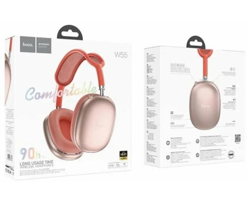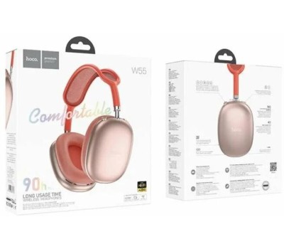 Hoco W55 — стильные беспроводные полноразмерные наушники для использования с ТВ, аудио, видео техникой, компьютером, телефоном или ноутбуком, обеспечивают беспроводную связь через версию Bluetooth 5.4. Наушники оснащены удобными, мягкими амбушюрами, в которых не чувствуется дискомфорт даже при длительном использовании. Гарнитура оснащена слотом для карты памяти, что дает возможность сделать из наушников аудиоплеер mp3. Устройство имеет емкость батареи: 800mAh, время работы в режиме использования составляет 90 часов, в режиме ожидания до 200 часов. Полная зарядка батареи займет около двух часов. Имеет два языка уведомлений английский и китайский.