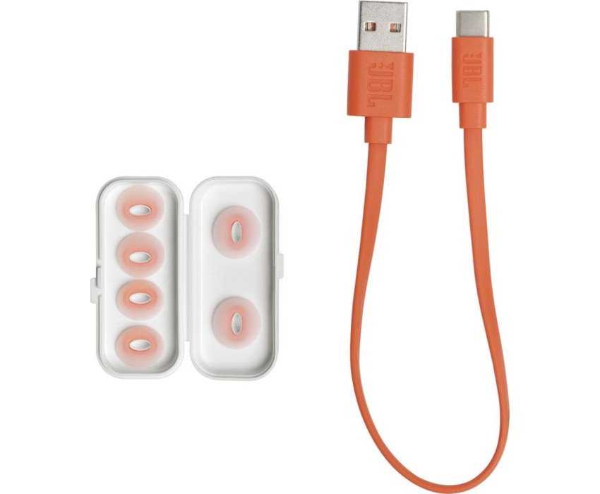 наушники JBL Tune Flex, 2 пары сменных амбушюр, документация, зарядная станция-футляр, кабель для зарядки футляра.