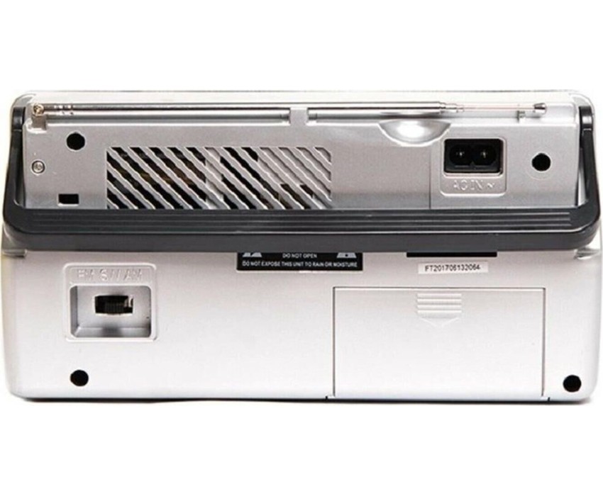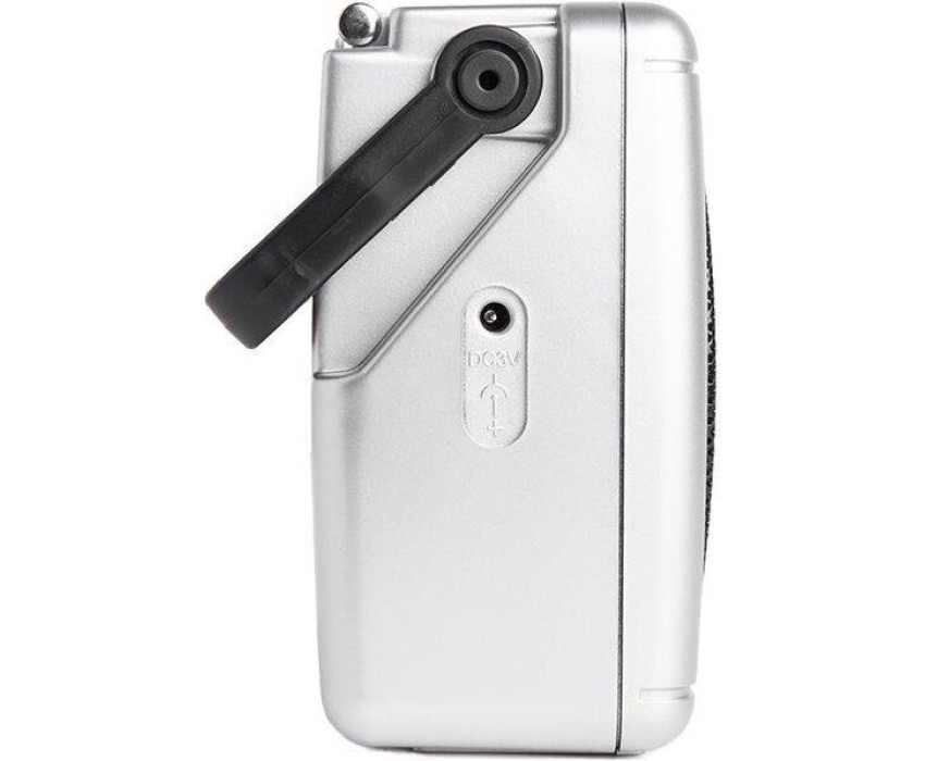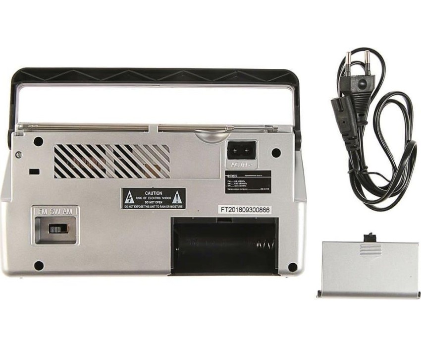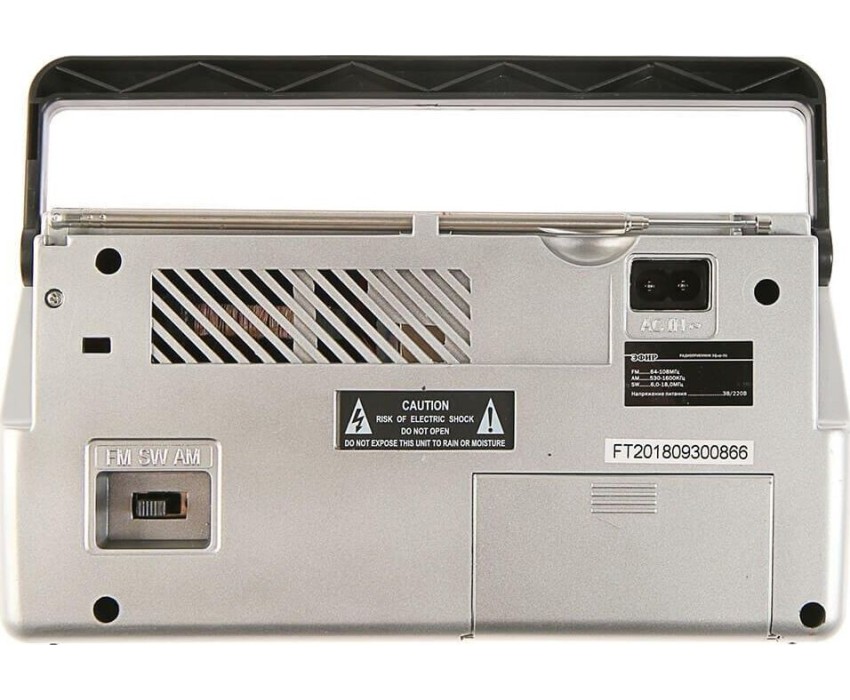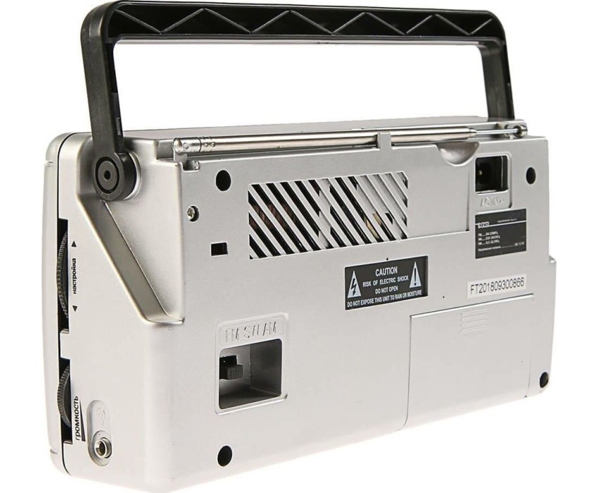 Тюнер аналоговый, диапазоны/частоты FM 64-108МГц, AM 520-1630КГц, SW 6,0-18,0МГц, 1 динамик, мощность динамика Ф76mm/8Ом/3W, питание 220В, батарейки R20*2шт (не в компл), размер 218х76х110мм, разъем для внешнего питания 3В, телескопическая антенна, разъем под наушники, ручка для переноски.