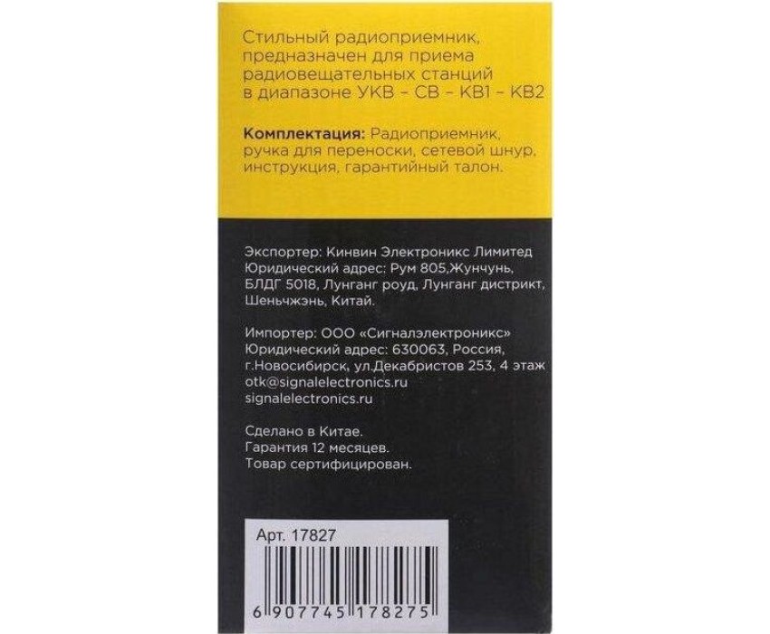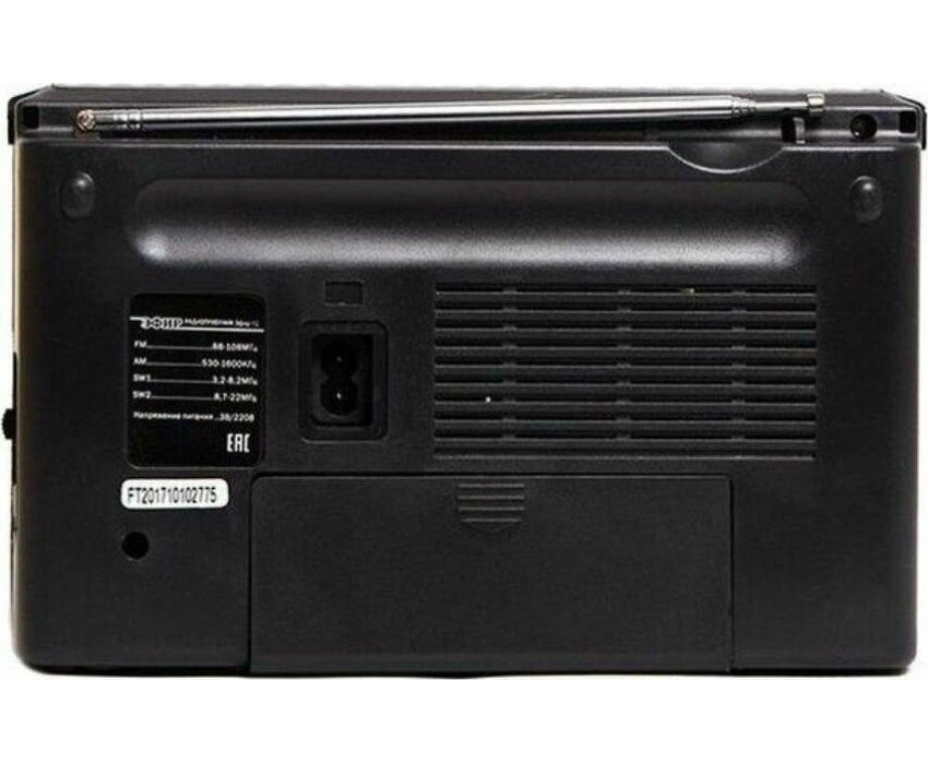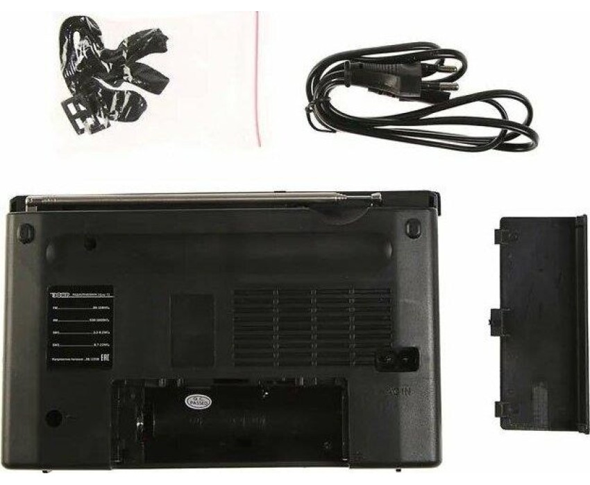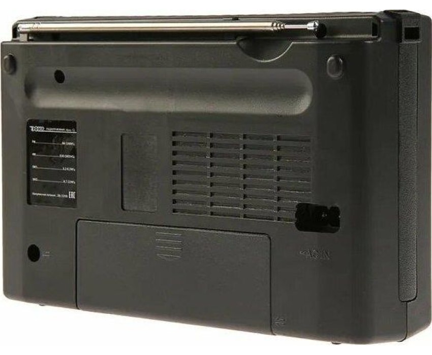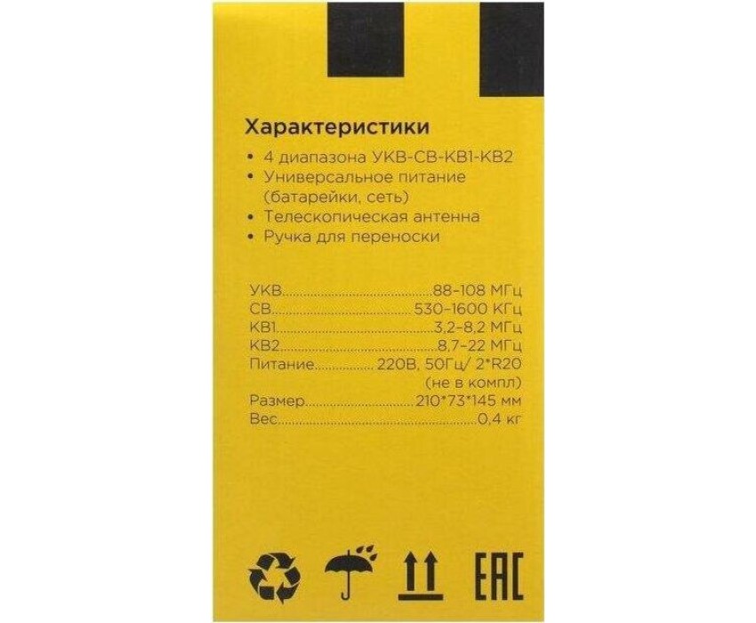 Тюнер аналоговый, диапазоны/частоты FM 88-108МГц, AM 530-1600КГц, SW1 3,2-8,2МГц, SW2 8,7-22,0МГц, 1 динамик, мощность динамика Ф76mm/4Ом/3W, питание 220В, батарейки R20*2шт (не в компл), размер 210х73х145мм, телескопическая антенна, разъем под наушники, ручка для переноски.