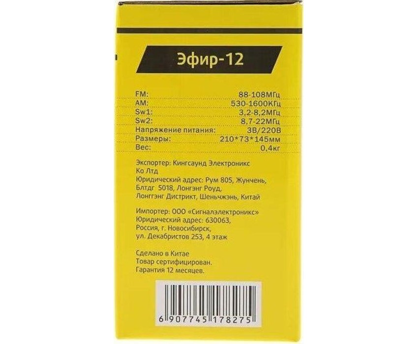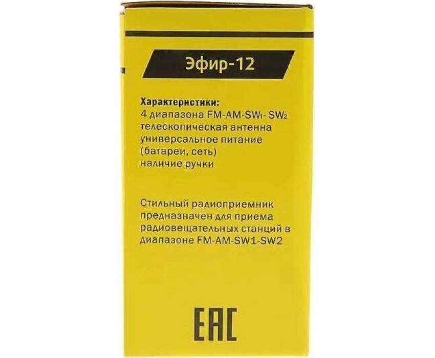 Радиоприемник ЭФИР 12 FM 64-108МГц, бат. 2*R20, 220V