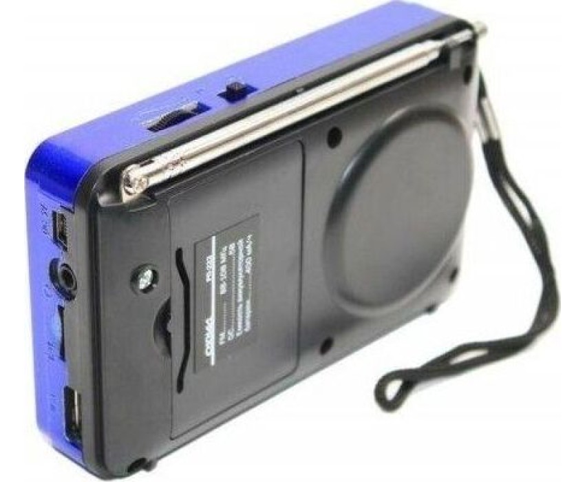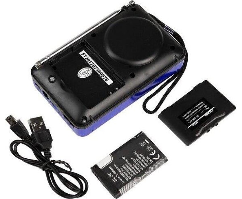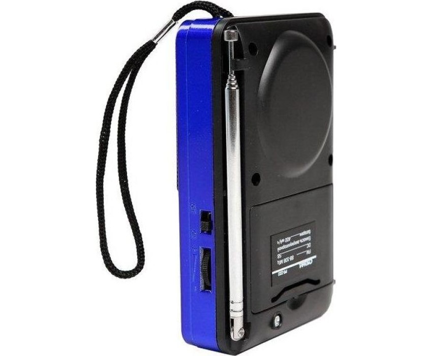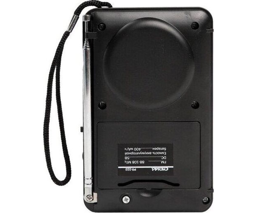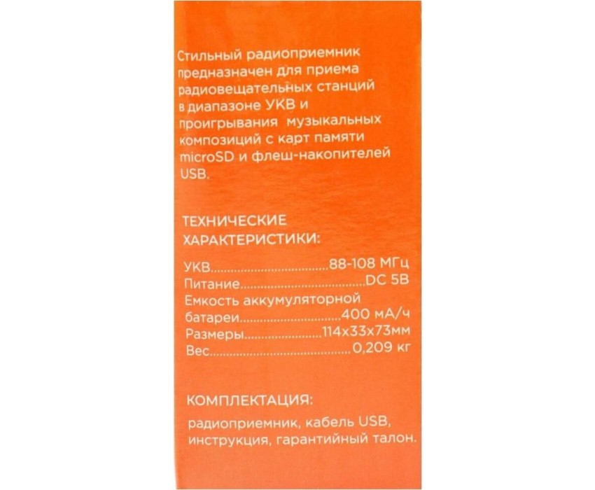 Цифровой тюнер, FM диапазон (FM-88-108МГц), автонастройка в FM диапазоне на 35 станций, 1 динамик (монозвучание) мощностью Ф57mm/4Ом/3W, питание 5В, аккумулятор типа BL-5C, емкостью 400мА/ч, размер 114*33*73мм, дисплей, возможность воспроизведения с USB, microSD (TF), разъем для внешнего питания 5В, телескопическая антенна, разъем под наушники, ручка для переноски.