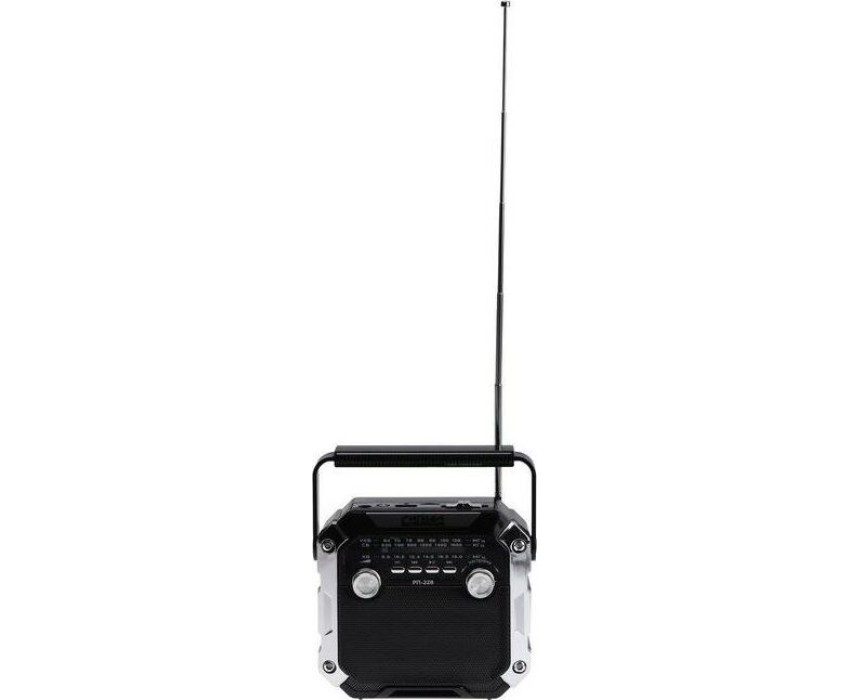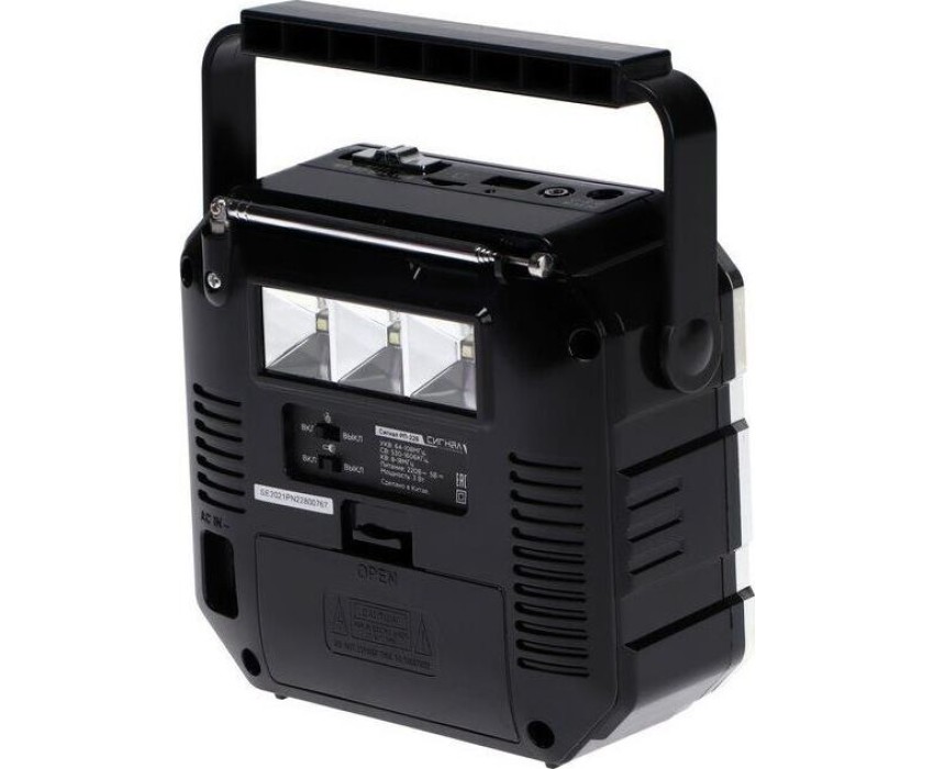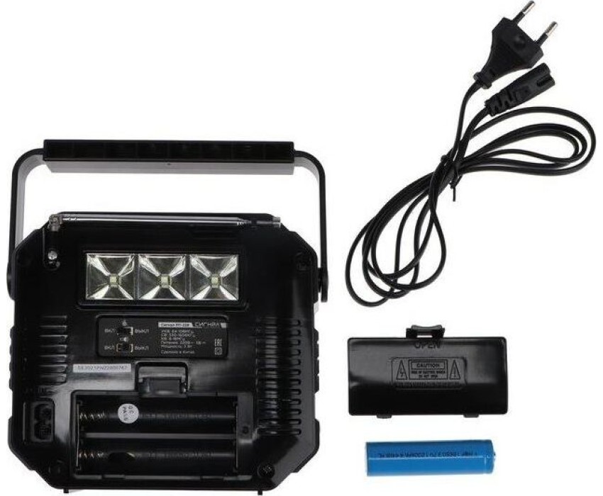Аналоговый тюнер, УКВ/СВ/КВ диапазоны (УКВ-64-108МГц, СВ-530-1606КГц, КВ-8,0-18,0 МГц), 1 динамик (монозвучание) мощностью Ф77MM/8Ом/3W, питание 220В, аккумулятор типа 18650, емкостью 1200мА/ч, размер 150*68*130, возможность воспроизведения с USB, microSD (TF), AUX, разъем для внешнего питания 5В, 1 встроенный фонарь 0,15Вт, телескопическая антенна, функция памяти воспроизводимой записи, функция дискосвета, ручка для переноски.