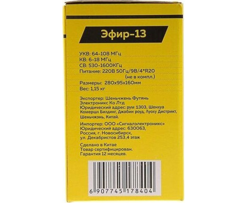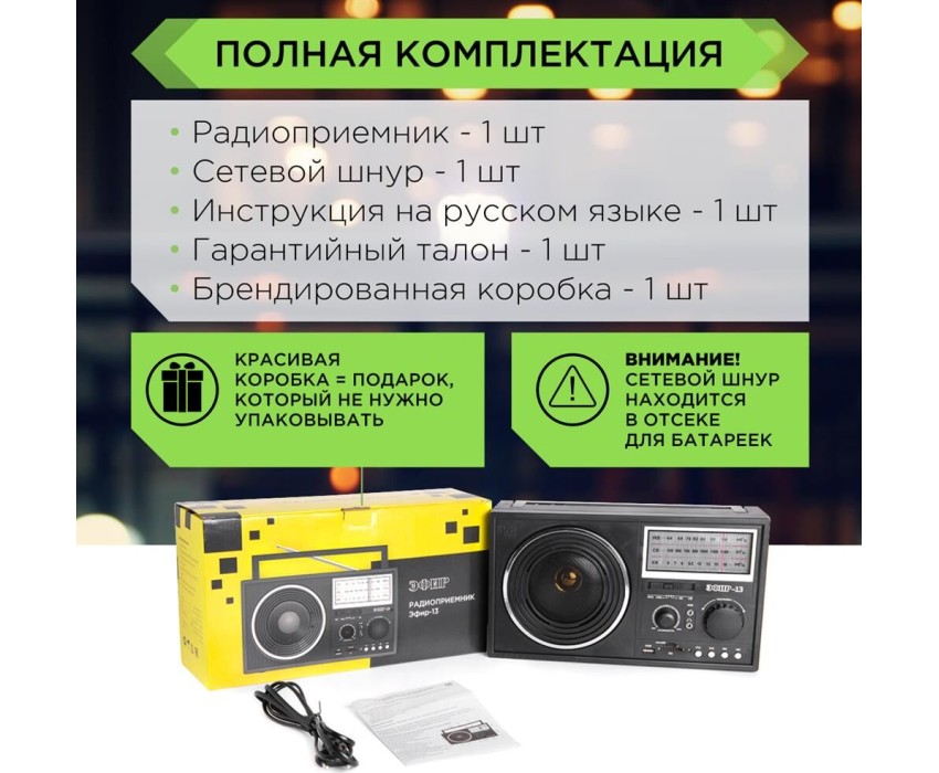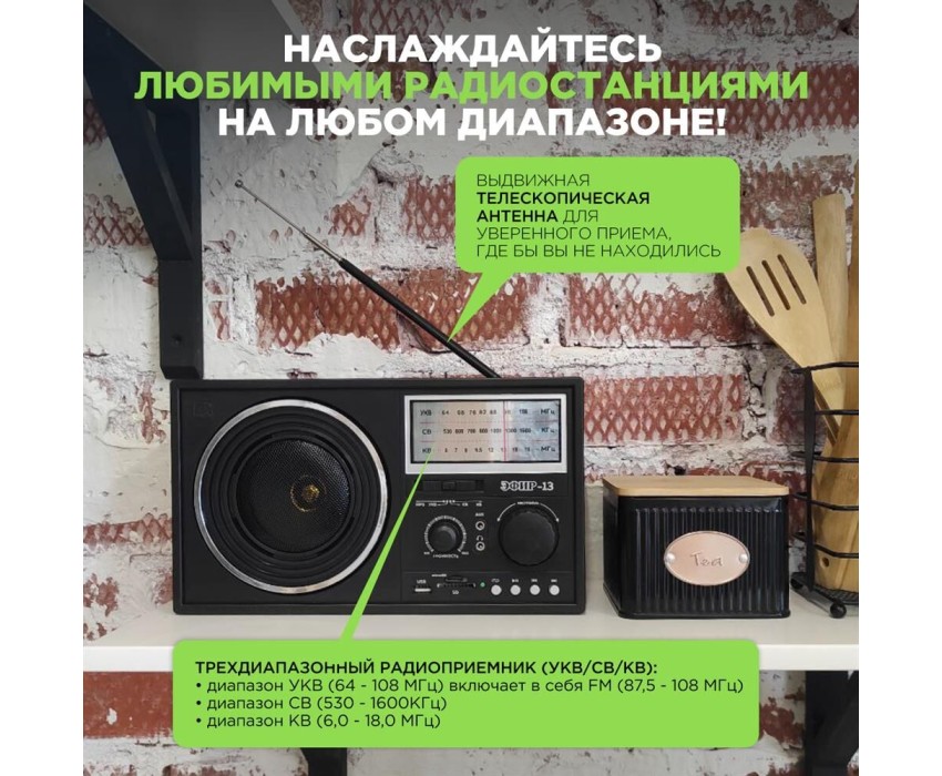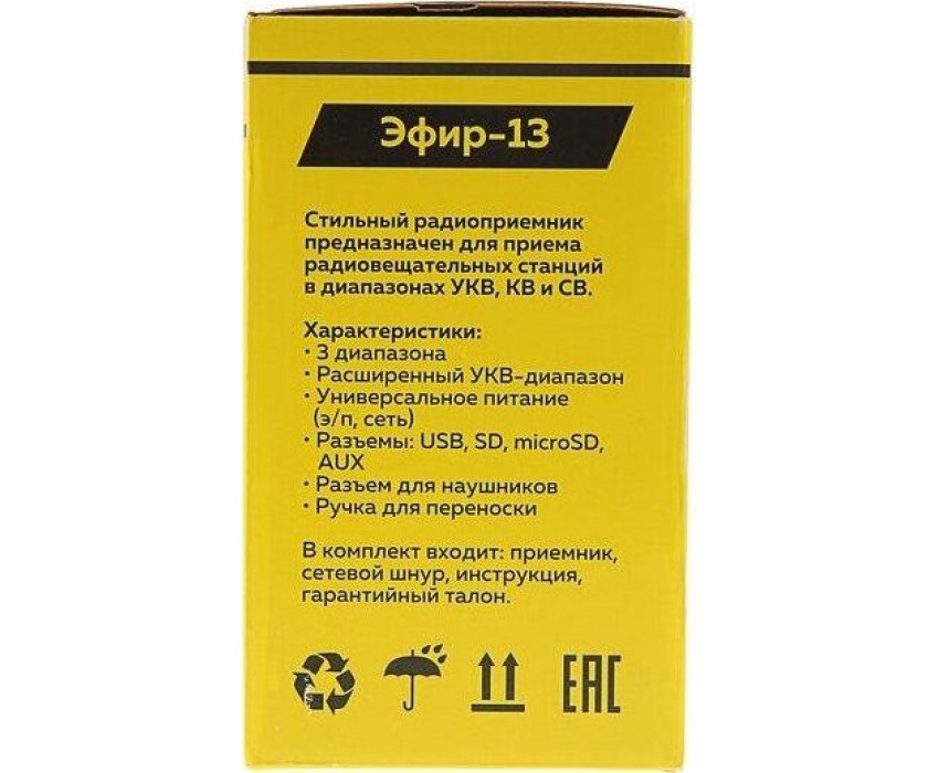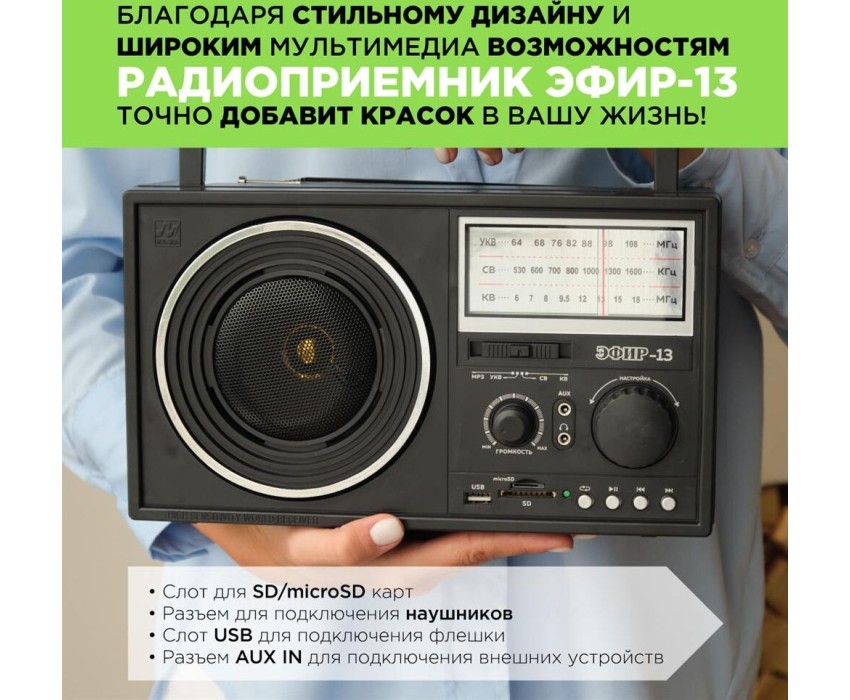 Радиоприемник ЭФИР 13 УКВ 64-108МГц, бат. 4*R20, 220V, USB/SD/microSD/AUX
