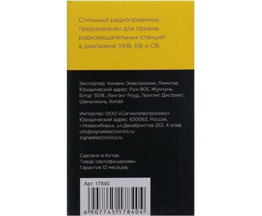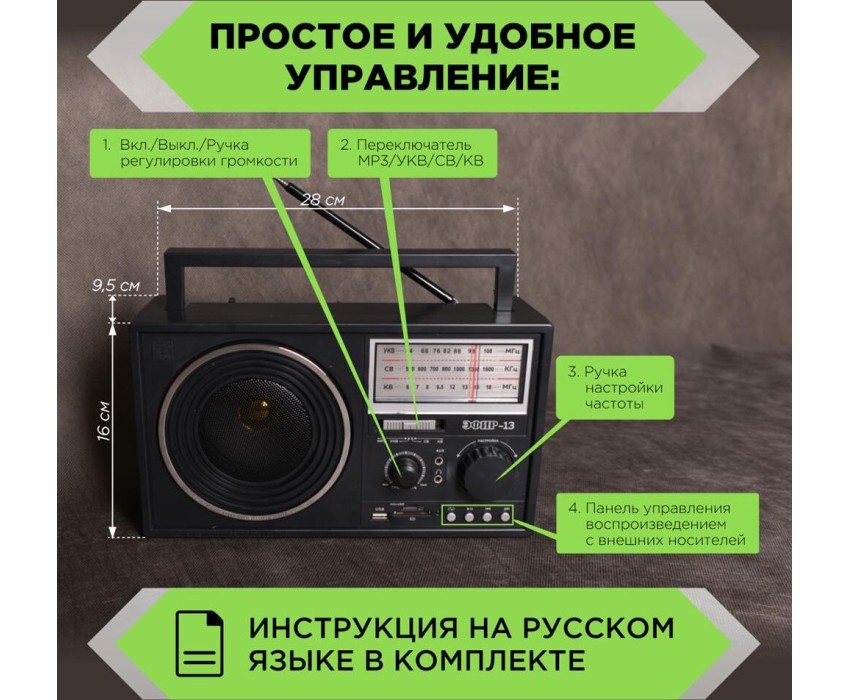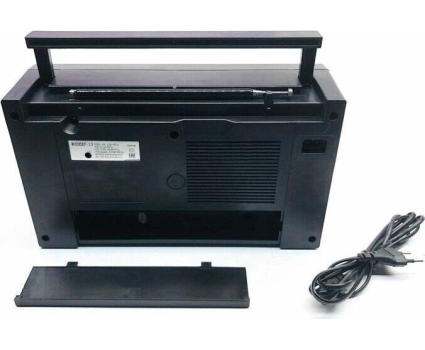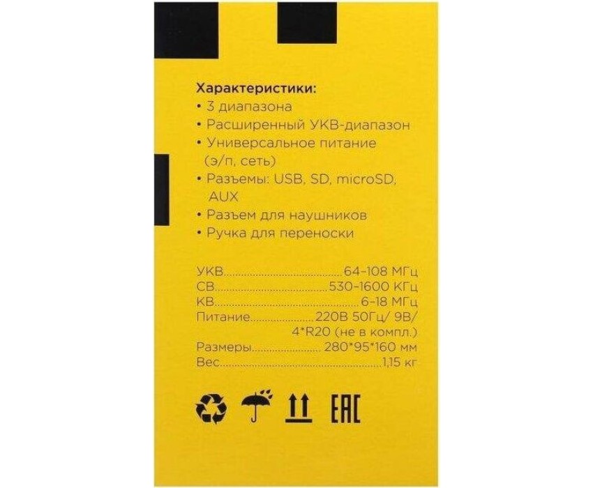 Тюнер аналоговый, диапазоны/частоты УКВ 64-108МГц / СВ 530-1600КГц / КВ 6,0-18,0МГц, 1 динамик, мощность динамика Ф100mm/8Ом/8W, питание 220V, батарейки R20*4шт (не в комплекте), размер: 280х95х160мм. воспроизведение с USB, SD, microSD(TF), AUX, разъем для внешнего питания 6V, телескопическая антенна, разъем под наушники, ручка для переноски.