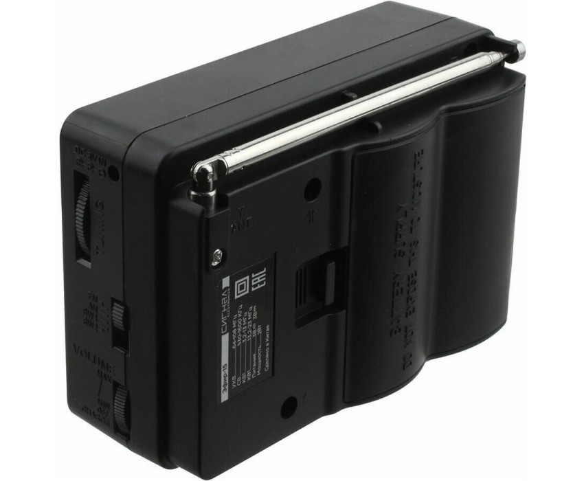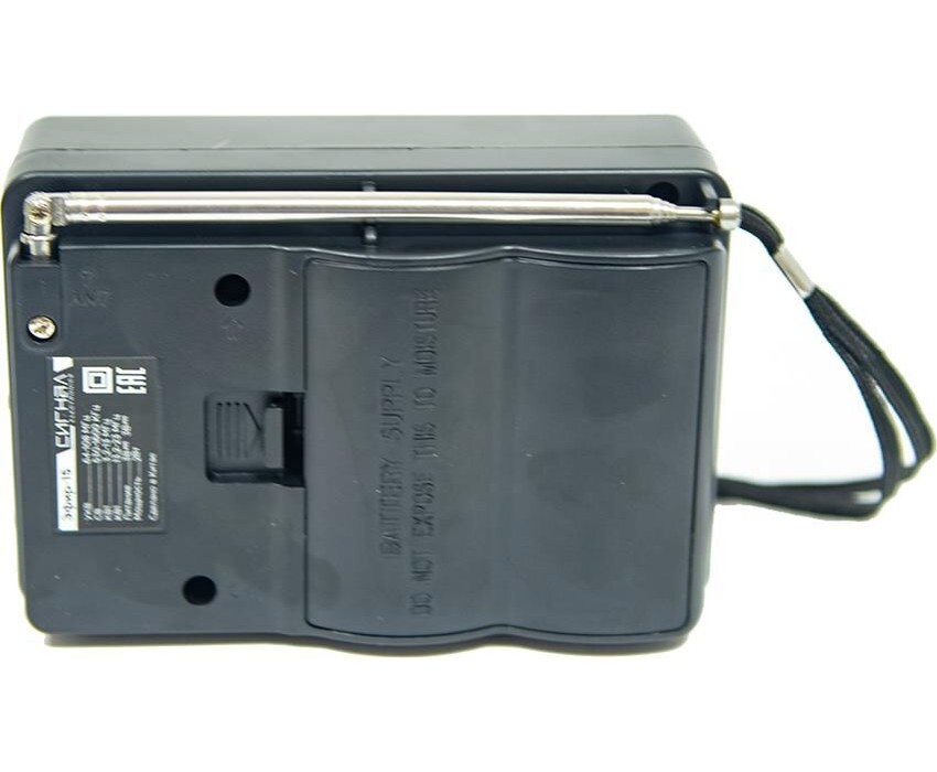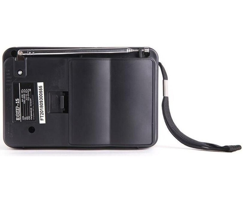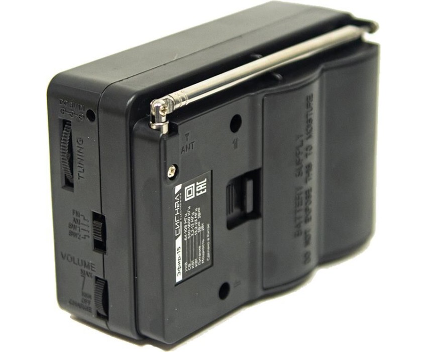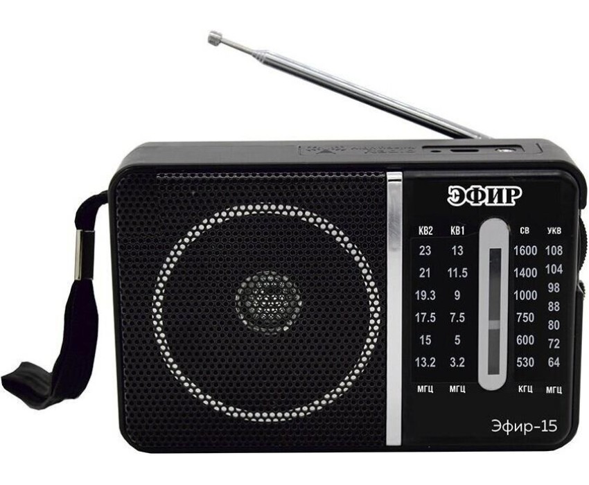 Эфир-15 имеет аналоговый тип тюнера, обеспечивает сигнал в диапазонах УКВ/СВ/КВ1-2 с частотой УКВ(64-108МГц) / СВ (530-1600КГц) / КВ1, КВ2 (3,2-23МГц) соответственно, наличие 1-го динамика с мощностью 100mm/8 /8W. Радиоприемник работает от батареек R20, тип D и питания Mini USB, размер изделия составляет 135х60х90 мм, телескопическая антенна, разъем для наушников. В комплектацию радиоприемника входит: само устройство, шнурок, инструкция полностью на русском языке, цветная упаковка и гарантийный талон. Товар сертифицирован, гарантия 12 месяцев.