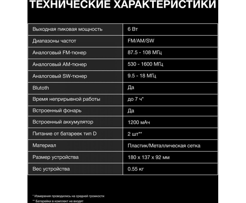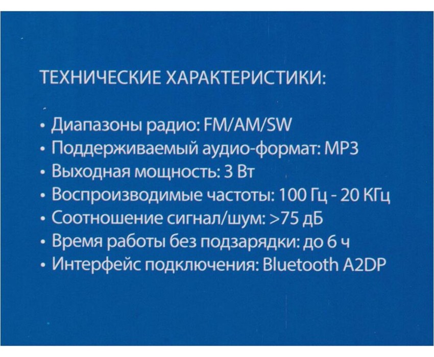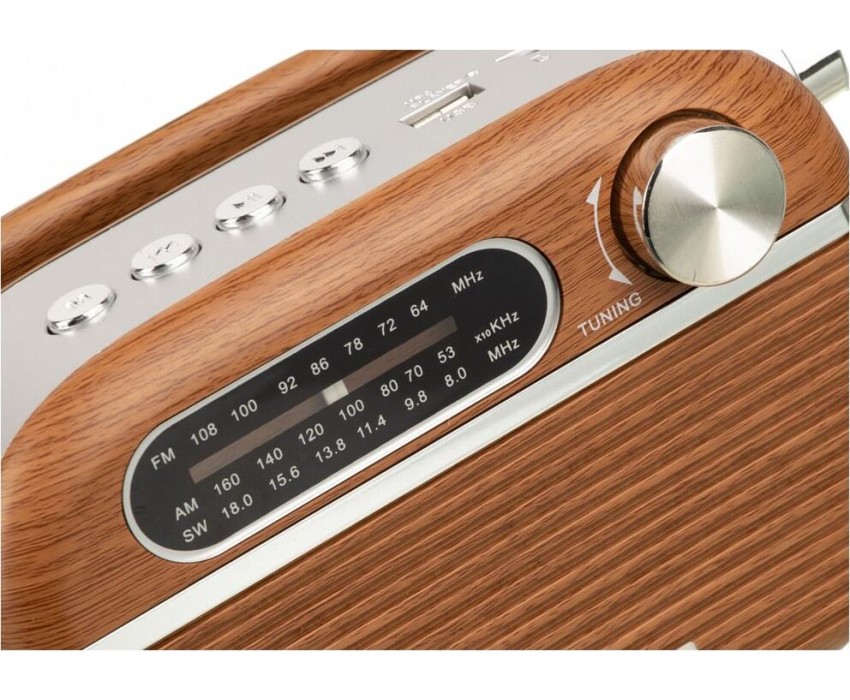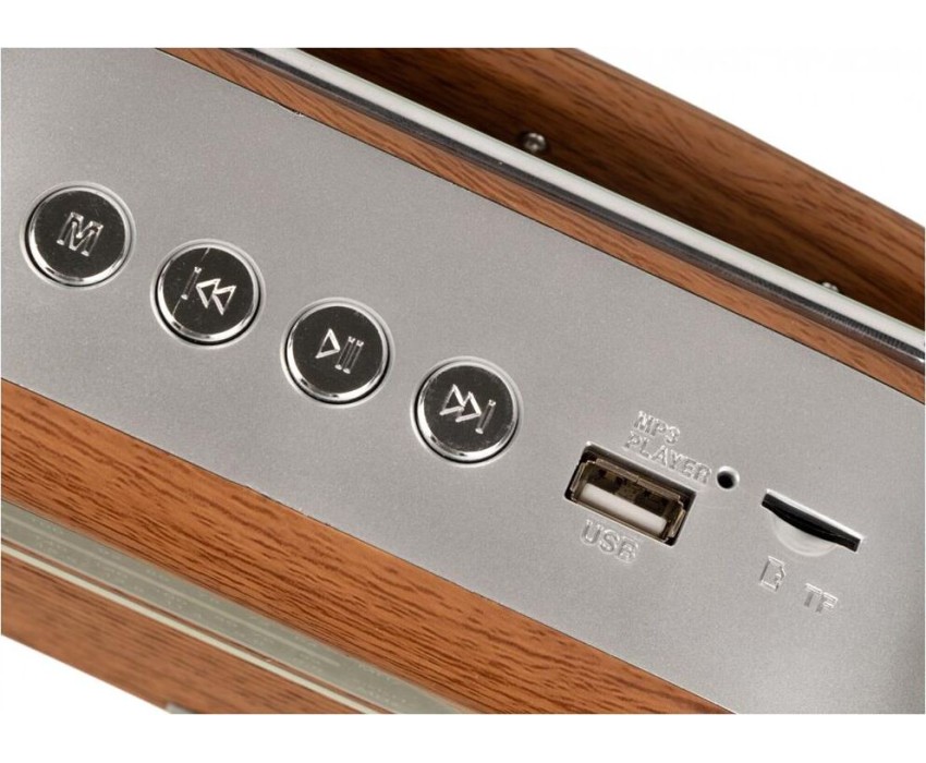 Тип тюнера аналоговый FM-диапазон ДА AM-диапазон ДА SW-диапазон ДА Тип антены телескопическая Звук Количество динамиков 1 Мощность динамика (Вт) 3 Вт Разъемы, интерфейсы Разъем USB 1 Разъем для карт памяти microSD Питание Возможность питания от сети ДА Время автономной работы 6 ч Тип батарей питания аккумулятор Особенности Воспроизведение файлов MP3 Ручка для переноски ДА Особенности Bluetooth Корпус Цвет дерево коричневое Дополнительный цвет серебристый