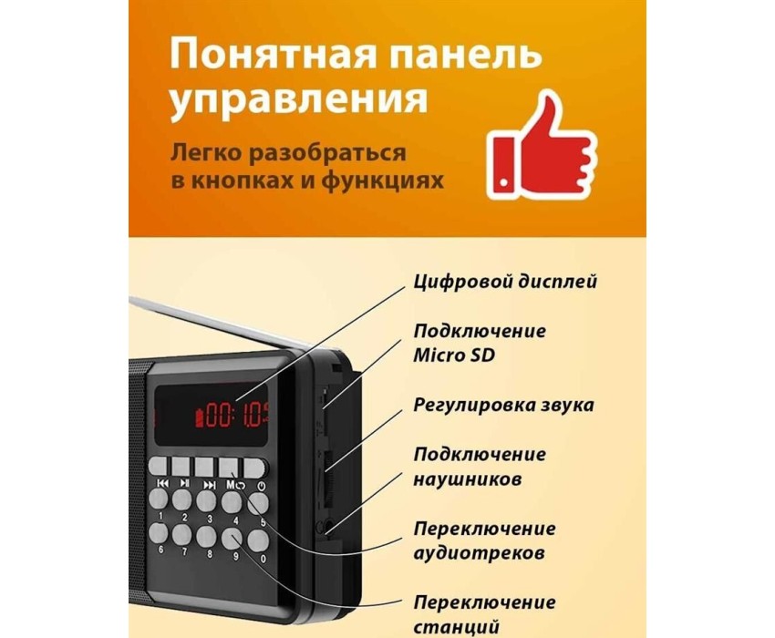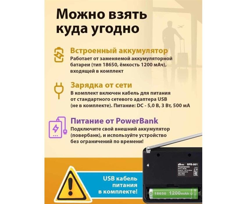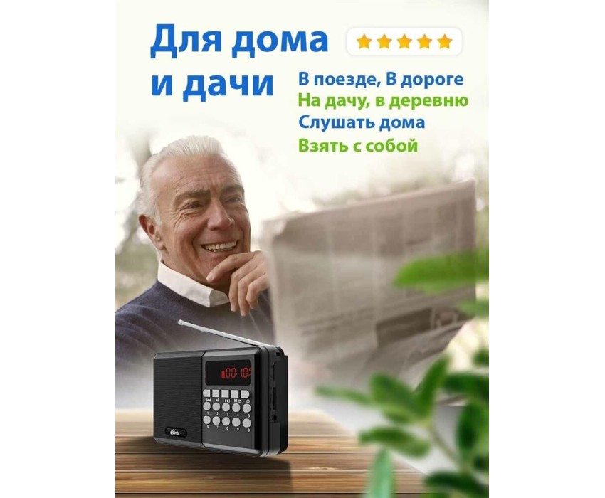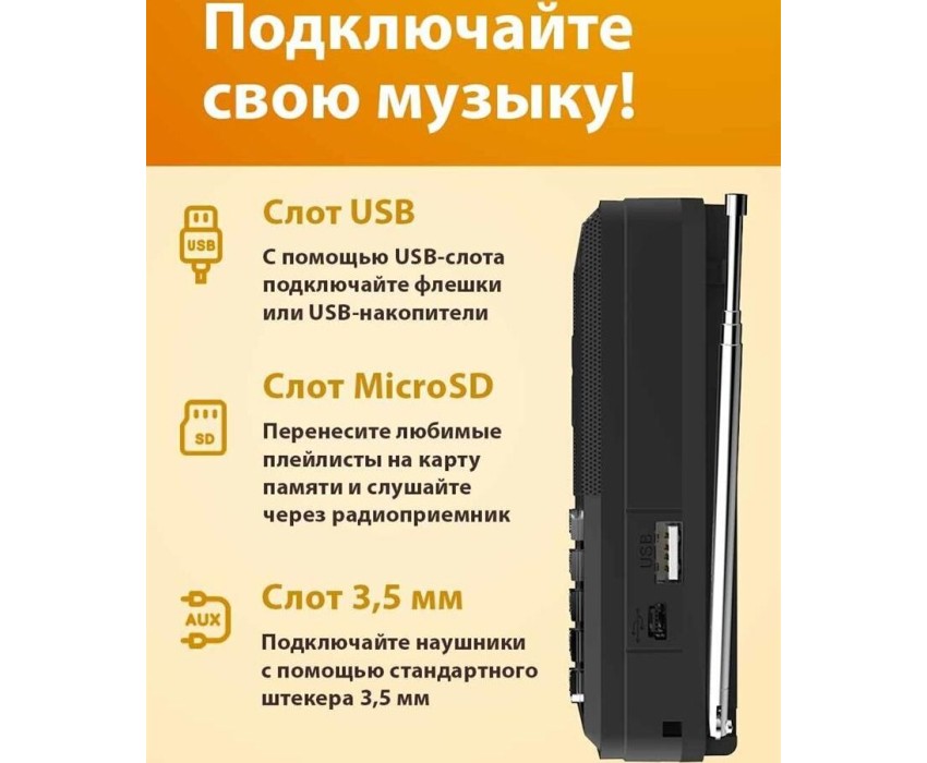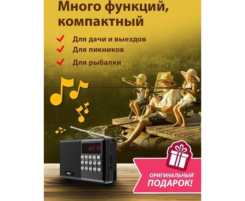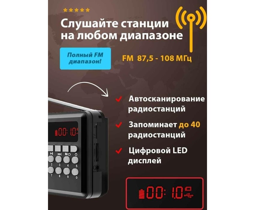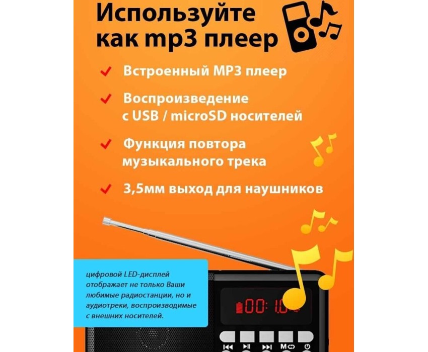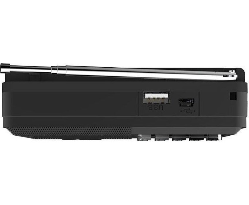 FM-радио, цвет: черный, FM (87,5 - 108 МГц), 1 динамик. Телескопическая антенна, ручка для переноски. Источник питания: AC 220V 50Hz / DC - 5,0 В, батарея Li-ion 18650