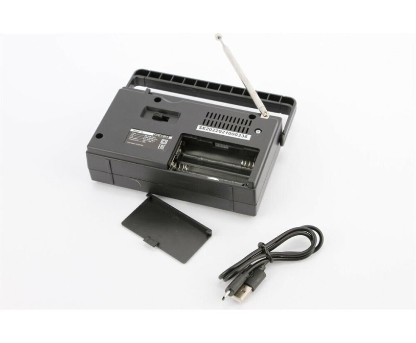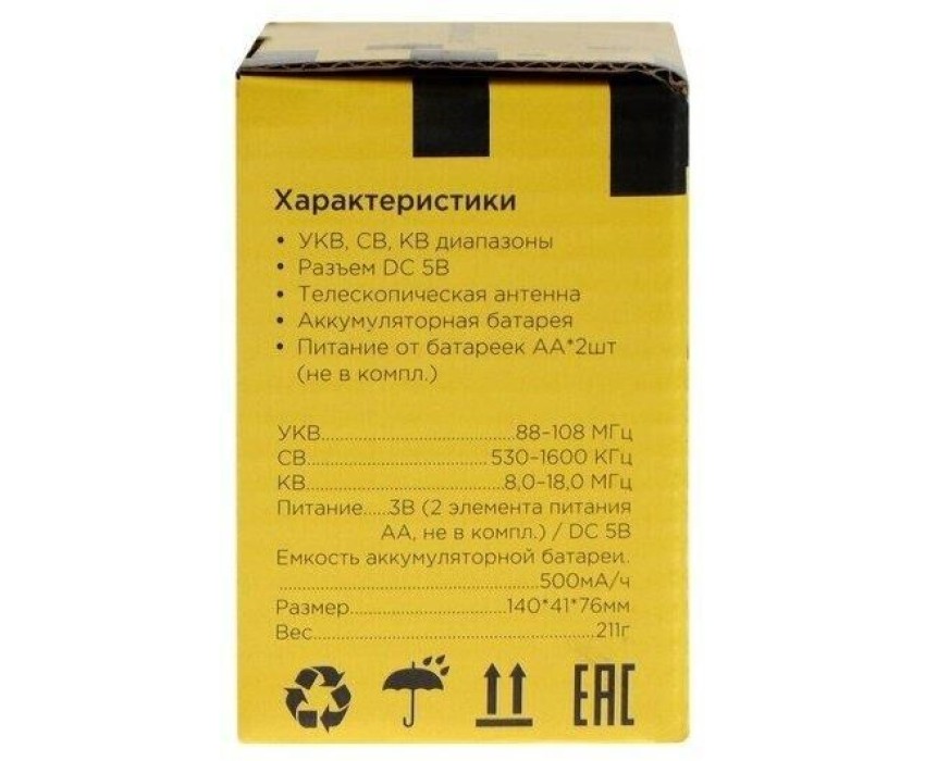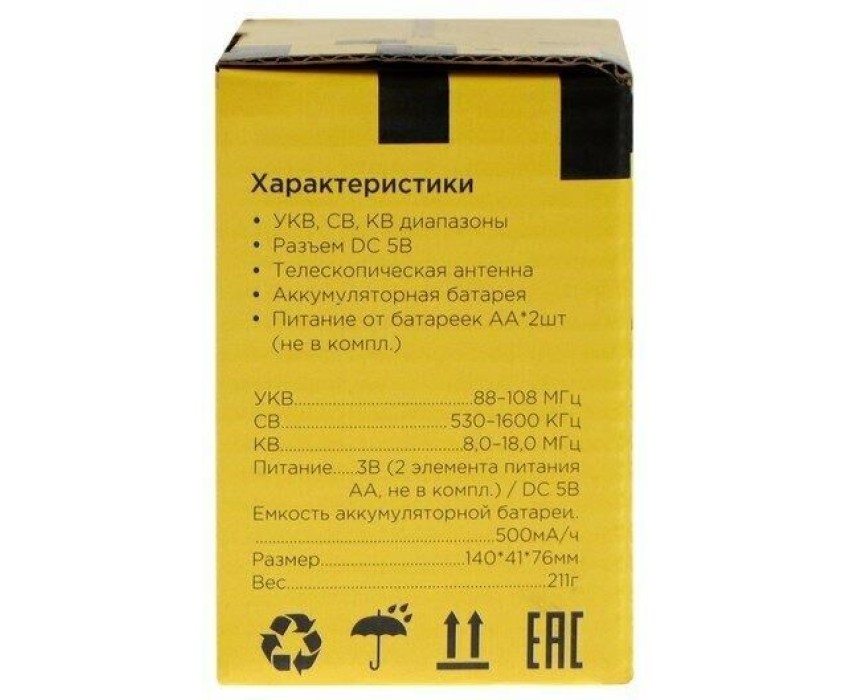 Тип: портативный. Тип тюнера: цифровой. FM-диапазон: поддерживается. Тип антены: телескопическая. Разъем подключения наушников: 3.5 мм. Внешний динамик: есть. Цвет: черный. Вес товара: 400. Особенности: Светодиодный фонарь 0,5Вт; Светодиодная подсветка с эффектом дискосвета.. Количество динамиков: 1. Воспроизведение файлов: MP3. Встроенный фонарь: есть. Габариты упаковки (ед) ДхШхВ: 0.17x0.07x0.12. Вес упаковки (ед): 0.14. Гарантия: 12 мес.. Элементы питания: 2 х D. Размеры (ШхВхГ): 145 х 100 х 63 мм