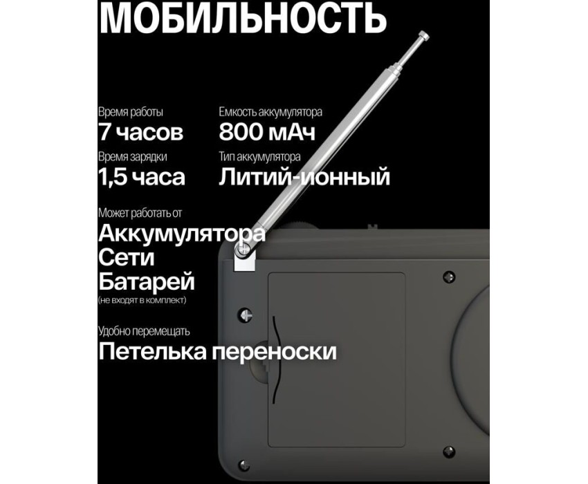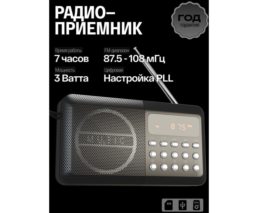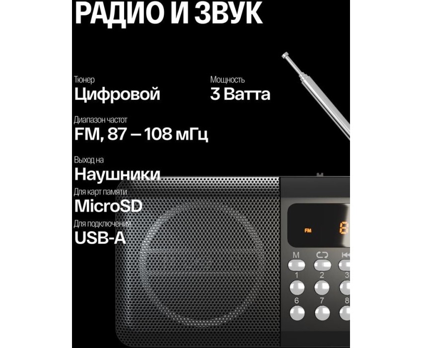 ПОРТАТИВНЫЙ РАДИОПРИЕМНИК FM-радио: 87.5 – 108 МГц Встроенная батарея: 800 мАч Выходная мощность: 3 Вт Поддержка аудионосителей: USB/TF (до 32 ГБ) Воспроизведение формата MP3 Выход для наушников: 3.5 мм jack Цвет: чёрный