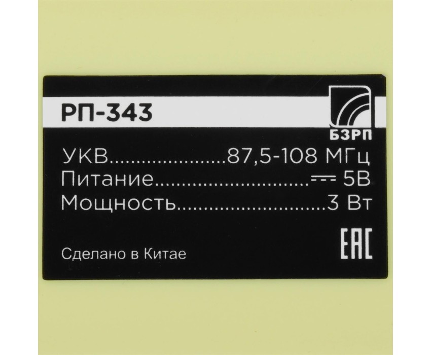 БЗРП Fresh РП-343 – радиоприемник в зеленом цвете. На фасаде имеется запоминающаяся надпись: «Яркая музыка». Свой ретро внешний вид радио сочетает с современными функциями внутри. Благодаря Bluetooth соединению можно подключаться и использовать приемник как колонку. USB порт позволяет воспроизводить любимые композиции в любом месте, на любой удаленности от связи. AUX вход дает возможность соединения с различными источниками звука.
