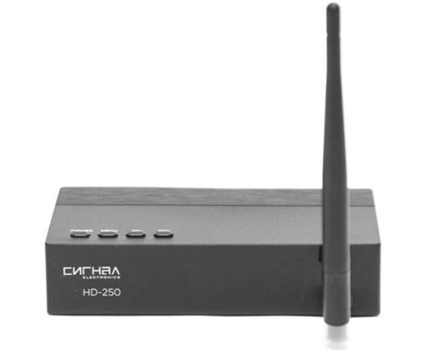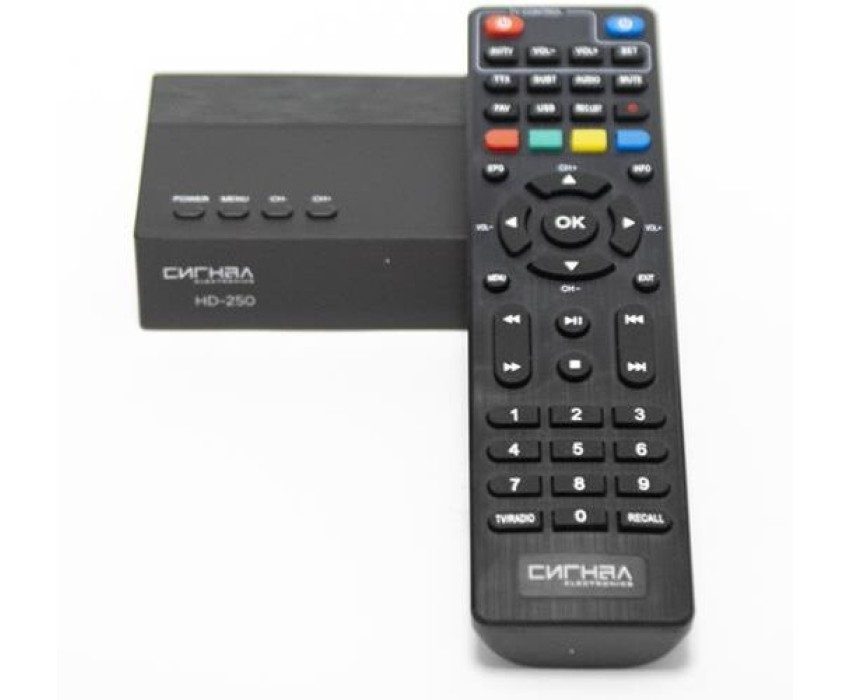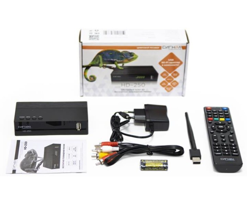 Это высококачественный ТВ ресивер с обучаемым пультом управления в комплекте (можно с одного пульта управлять и ресивером, и телевизором). HD-250 подходит для приема ЭФИРного цифрового телевидения в формате DVB-T/T2/C. Его яркая упаковка не останется незамеченной на полке магазина. Сам ресивер выполнен из пластика и в лаконичном дизайне. Особенность этого ресивера в его комплектации. Вместе с устройством вы получаете USB Wi-Fi адаптер 7601. Это позволяет телевизору с помощью ресивера подключаться к беспроводной сети. Так с TV устройства можно выходить в интернет. На ресивере расположены следующие разъемы: антенный вход, 2 USB-разъема, HD OUT, композитный аудио-видео выход, разъем для подключения внешнего блока питания. HD-250 оснащен чипсетом GX6701. Поддерживает диапазон частот 174-862МГц. Ресивер имеет размер 120х64х28мм.