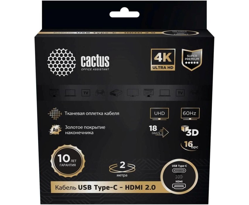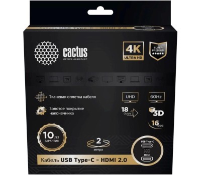 CACTUS Кабель аудио-видео CS-USBC-HDMI-2-2 USB Type-C (m)/HDMI (m) 2м. позолоч.конт. черный