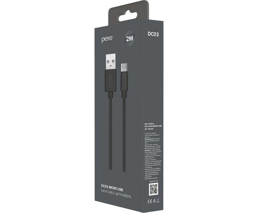 дата-кабель PERO DC-03 MICRO-USB, 2А, 2М, ЧЕРНЫЙ