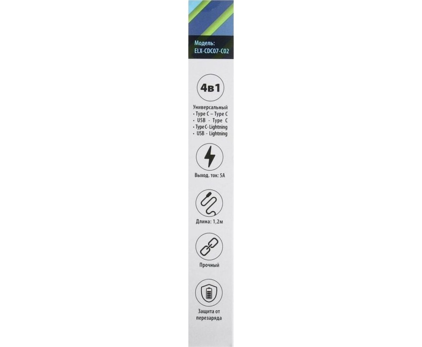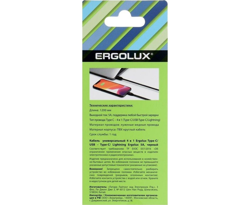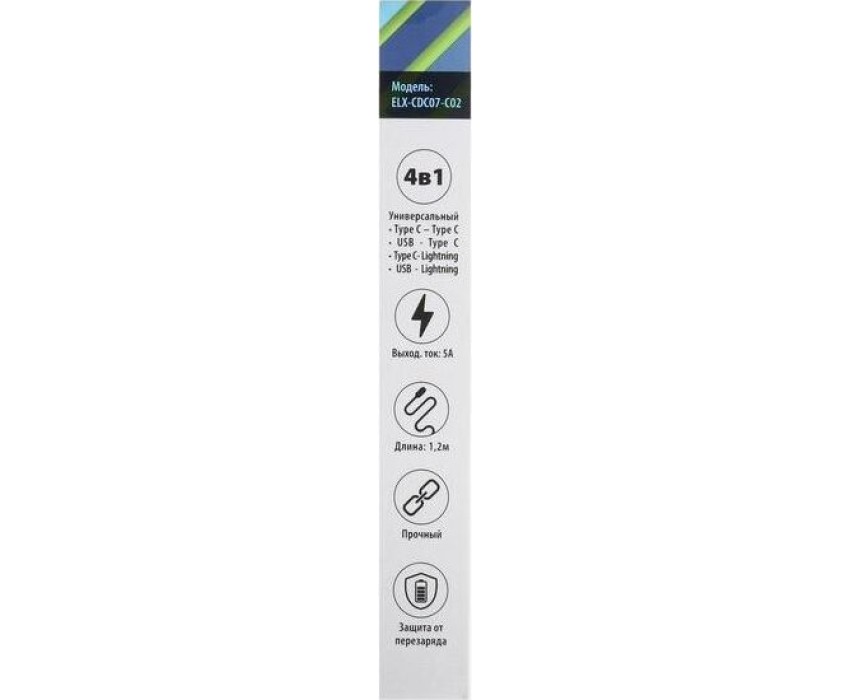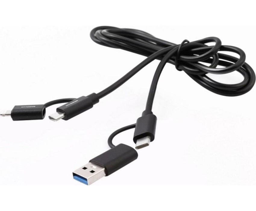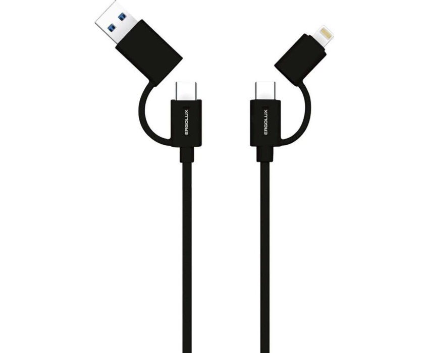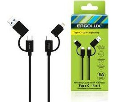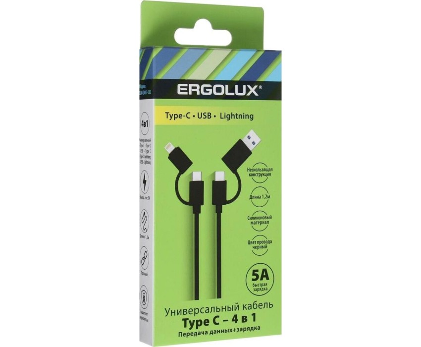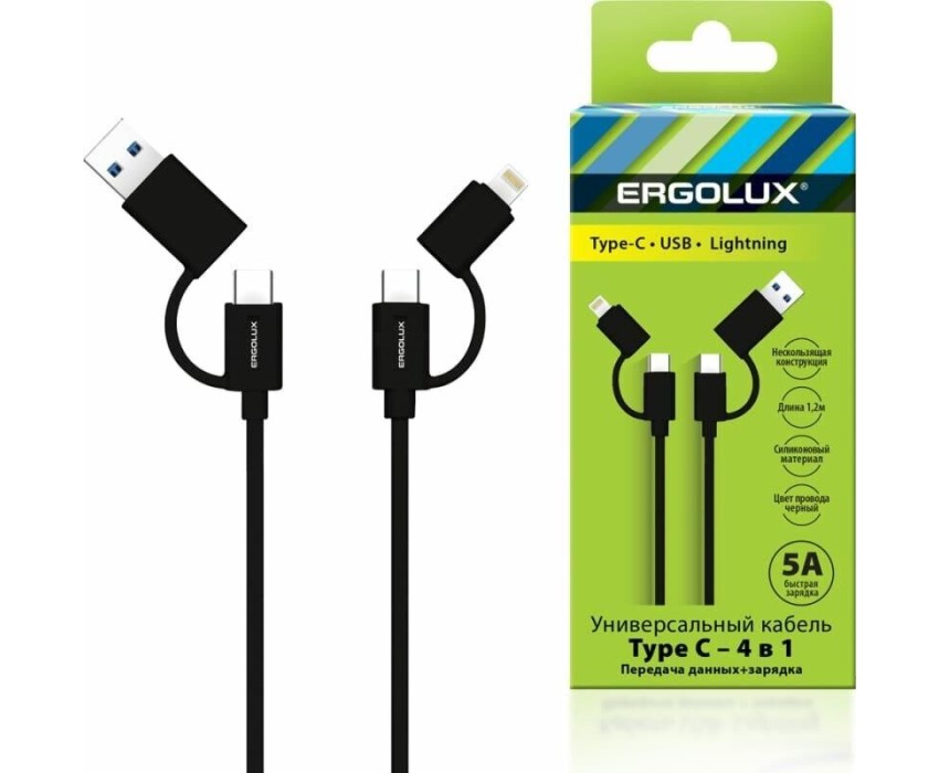 • Тип провода: 4 в 1 (USB/Type C-Type C/Lightning) • Сила тока: 5А • Мощность: 60Вт • Быстрая зарядка • Кабель для зарядки + передача данных • Длина кабеля: 120 см • Материал: PVC оплётка + силикон • Цвет: Черный • Упаковка: Коробка