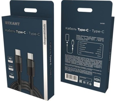 Кабель REXANT (18-7071) Type-C - Type-C, 3A, 60Вт, 1м, в черной нейлоновой оплетке