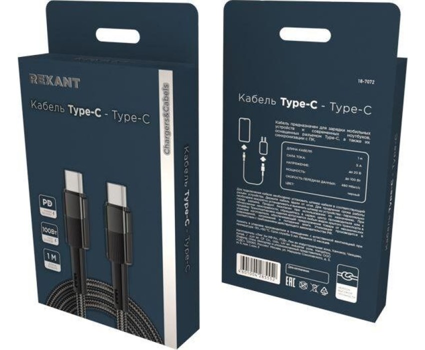 Кабель REXANT (18-7072) Type-C - Type-C, 5A, 100Вт, 1м, в черной нейлоновой оплетке