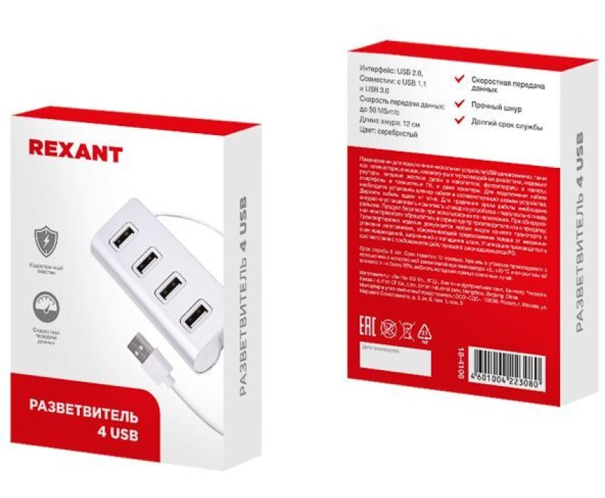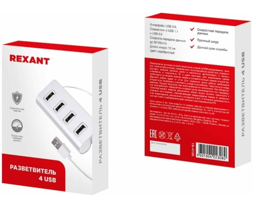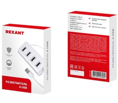 USB-разветвитель (хаб) торговой марки REXANT предназначен для подключения нескольких устройств USB одновременно, таких как: компьютерные мыши, клавиатуры и мультимедийные джойстики, модемы и роутеры, внешние жесткие диски и накопители, фотоаппараты и камеры, смартфоны и планшетные ПК, и даже принтеры. Увеличение количества USB-портов на вашем компьютере не только снижает их износ, но и облегчает процесс использования. Данный прибор очень компактен и идеально подойдет как владельцам портативных компьютеров, ноутбуков, так и пользователям стационарных компьютеров. USB Хаб REXANT не требует внешнего питания и обеспечивает отличную скорость передачи данных. Благодаря компактному размеру и весу, его легко можно носить с собой. Интерфейс: USB 2.0, совместим с USB 1.1 и USB 3.0 Скорость передачи данных: до 500 Мбит/с Длина шнура: 12 см Цвет: серебристый