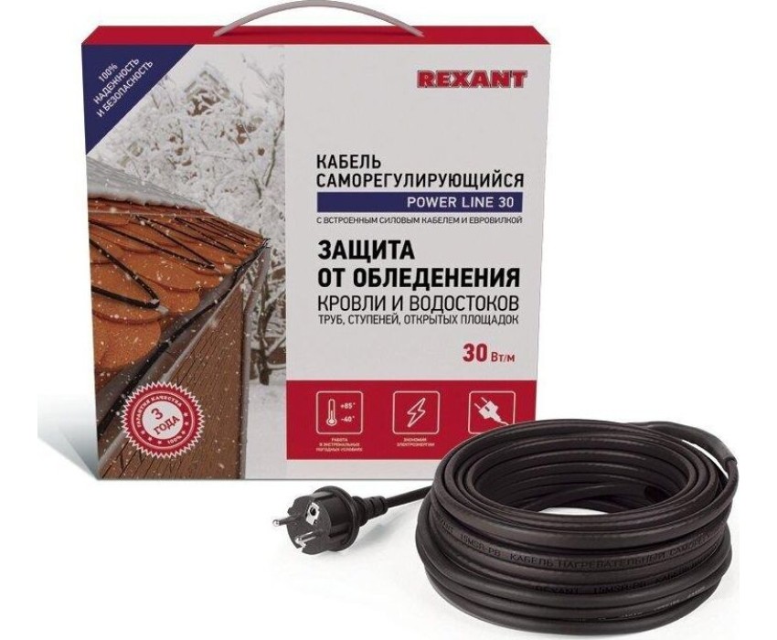 Комплекты саморегулирующегося кабеля Extra Line MSR-PB REXANT предназначены для защиты от замерзания бытовых трубопроводов, счетчиков воды, вентилей, а также могут использоваться для обогрева кровли и водостоков. Нагревательный кабель соединен с питающим кабелем, на конце которого находится евровилка для подключения в розетку с заземлением. Нагревательный кабель является саморегулирующимся и в нормальных условиях его температура не превышает 60 °C. Комплекты подходят для использования как в помещениях, так и на улице. Кабель может быть смонтирован на поверхности как металлической, так и пластиковой трубы, под теплоизоляцией. Кабель может пересекаться сам с собой.