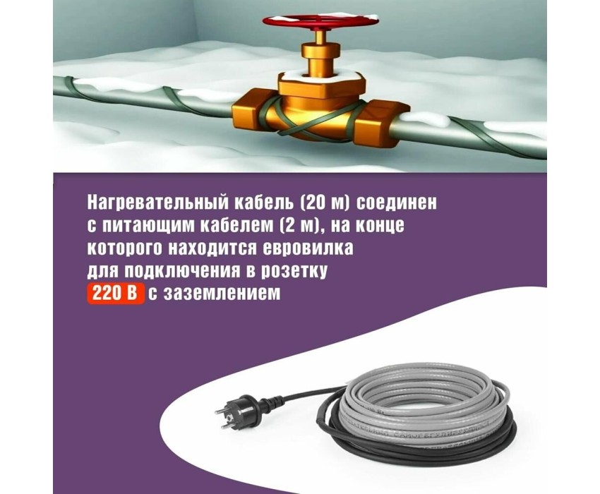 Комплекты саморегулирующегося кабеля MSR-PB REXANT предназначены для защиты от замерзания бытовых трубопроводов, счетчиков воды, вентилей и т. п. Нагревательный кабель соединен с питающим кабелем, на конце которого находится евро-вилка для подключения в розетку с заземлением. Нагревательный кабель является саморегулирующимся и в нормальных условиях его температура не превышает 60 °C. Комплекты подходят для использования как в помещениях, так и на улице. Кабель может быть смонтирован на поверхности как металлической, так и пластиковой трубы, под теплоизоляцией. Кабель может пересекаться сам с собой.