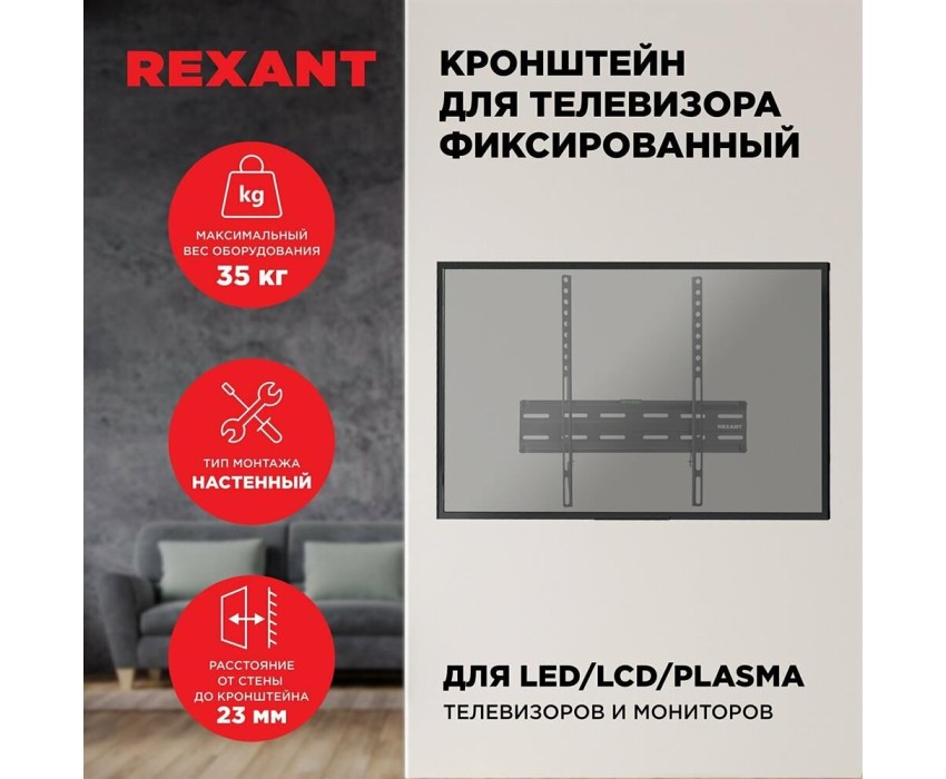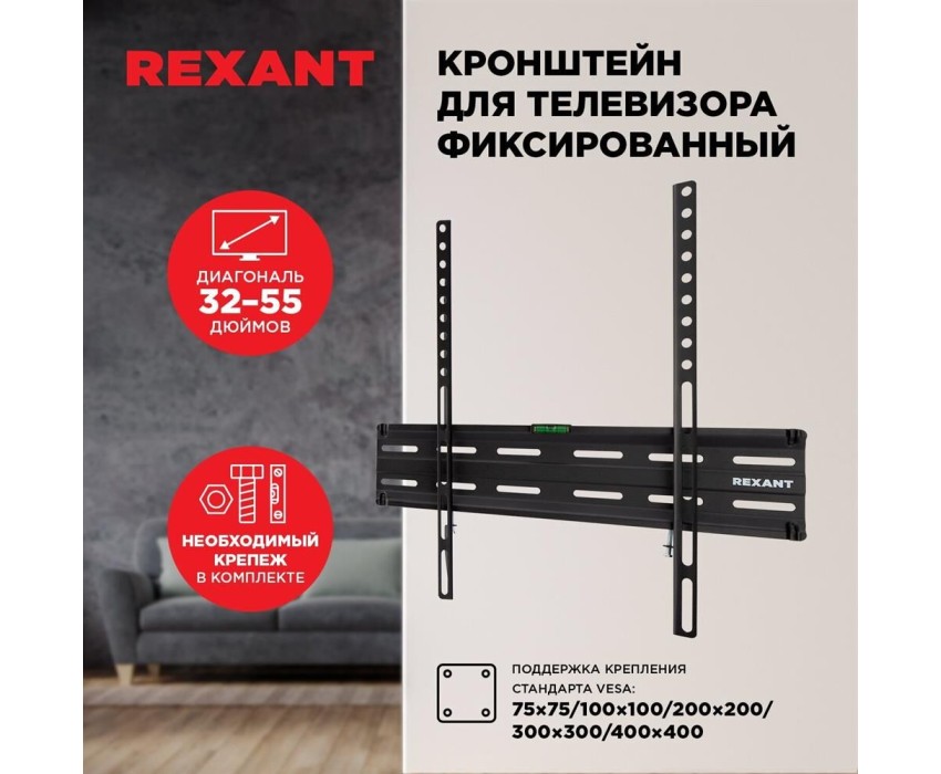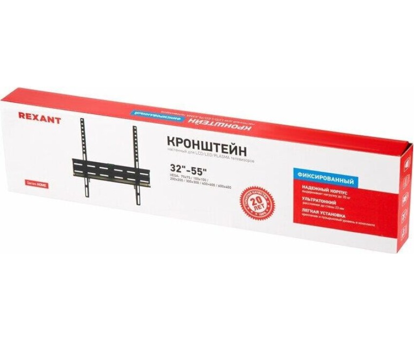 Кронштейн на стену для телевизора диагональю: 32"-55" дюймов фиксированный REXANT серия HOME Тип: фиксированный Назначение: для LED/LCD/PLASMA телевизоров и мониторов Цвет: черный Мин. диагональ: ТВ 32 дюйма Макс. диагональ: ТВ 55 дюймов Максимальный вес оборудования: 35 кг Тип монтажа: настенный Расстояние от стены до кронштейна: 23 мм Поддержка крепления стандарта VESA: 75х75/100х100/200x200/300x300/400x400 Пузырьковый уровень: в комплекте Крепление: в комплекте