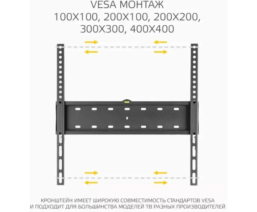 Назначение: для LCD- и LED-телевизоров. Совместимость с диагональю ТВ: 32, 40, 42, 43, 50, 55. Тип кронштейна: фиксированный. Совместимость: поддерживает ТВ с диагональю 32-55. Максимальный вес ТВ: 40 кг. Крепление стандарта Vesa: до 400х400. Типы VESA: 100x100, 200x100, 200x200, 300x300, 400x400. Угол наклона: 0°. Материал корпуса: сталь. Минимальное расстояние от стены: 27 мм. Максимальное расстояние от стены: 27 мм. Комплектация: Кронштейн, вертикальные опоры, крепежные детали, инструкция, гарантийный талон. Цвет: черный. Размеры (ШхВхГ): 433x425x27 мм.