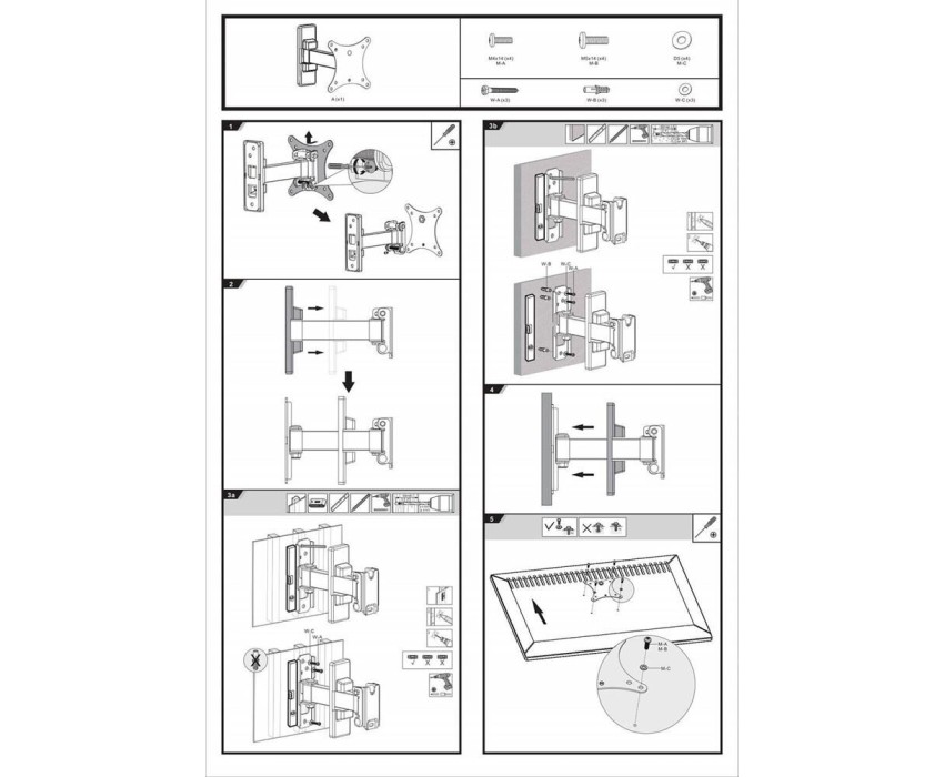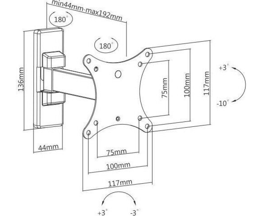 Диагональ экрана: 13"-27". VESA: 75x75, 100x100. Максимальная нагрузка: 20 кг. Расстояние от стены: 44-192 мм. Угол поворота: +90°~-90°. Угол наклона: +3°~-10°. Горизонт экрана: +3°~-3°. Материал: холоднокатаная сталь, пластик. Протестировано весом в 2 раза больше максимально допустимого. Угол обзора легко регулируется без дополнительных инструментов. Конструкция свободного наклона. Встроенная регулировка уровня и индикатор поворота. Простая конструкция легко устанавливается.