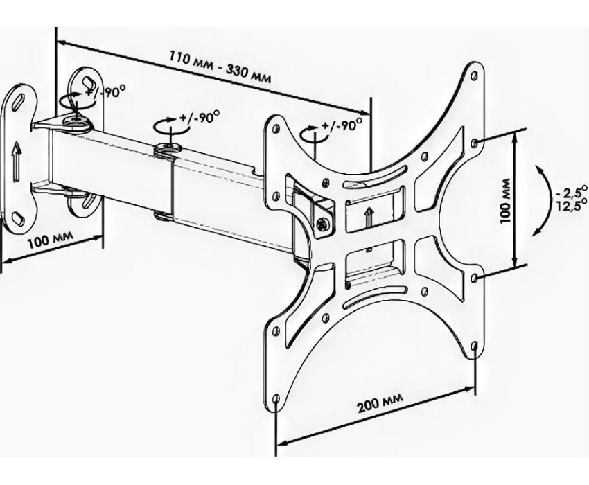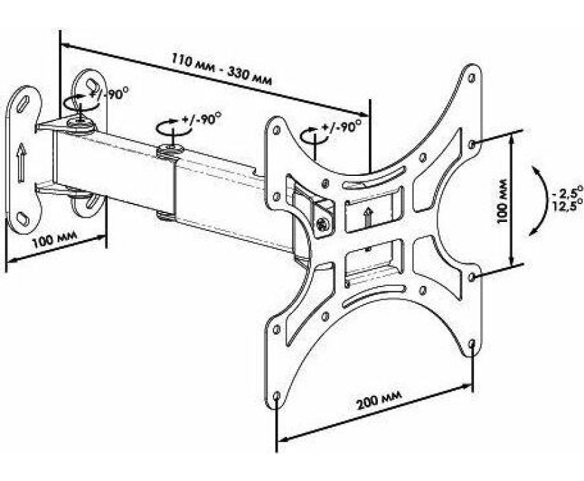 Тип: наклонно - поворотный, с вращением и частичным складыванием ugol -2,5°/ 12,5° povorot+/-90° Диагональ: 17" -32" (43 см – 81 см) Стандарт VESA: 100*100, 100*200, 200*200 Нагрузка: до 25 кг. Цвет белый.