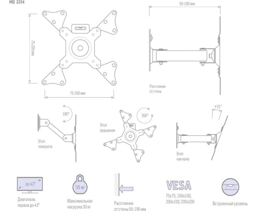 Тип кронштейна Наклонно-поворотный. Крепежные отверстия (VESA) 75x75 - 200x200. Мин. диагональ экрана (дюймы) 15. Макс. Диагональ экрана (дюймы) 43. Максимальная нагрузка, (кг.) 30. Угол наклона (°) +/-15. Угол повотора (°) 180. Вращение экрана (°) 360. Расстояние от стены (мм.) 50-360. Цвет кронштейна белый. Гарантия (лет) 2.