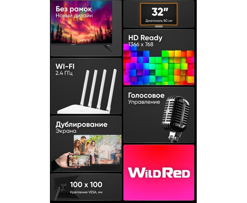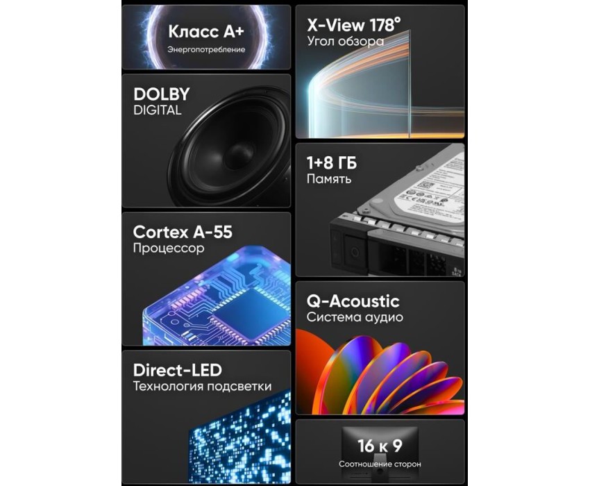 Диагональ дисплея 31.5" (80 см). Разрешение 1366 x 768. Тип экрана Безрамочный. Яркость (кд/м2) 220. Контраст 5000:1. Время отклика (мс) 7. Формат 16:9. Углы обзора (верт. х гориз.) 178 х 178. Поверхность Глянцевая. Стандарт вещания. DVB-T / DVB-T2 / DVB-C / Аналоговый Системы звука BG / DK / I / L. Система цветности PAL / SECAM. Количество каналов 99 аналоговых, 800 цифровых. Операционная система Android 11. Процессор ARM Cortex-A55, 1.1 ГГц, 4 ядра. Графический процессор ARM Mali-G31, 700 МГц, 2 ядра. Оперативная память 1 ГБ. Встроенная память 8 ГБ (часть встроенной пямяти занимает ОС). Wifi 2,4 ГГц. Порт Ethernet (LAN) 10/100 Мбит. HDMI 3 шт. / (1.4a). HDMI функции CEC / ARC / HDCP (2.2). Встроенный порт USB 2 шт. / (2.0). CI порт CI+ (1.4). Выходы наушники (3,5мм) / оптический аудиовыход (Toslink). Входы композитный видеовход (RCA) / стерео аудиовход (RCA). Питание ~110-240 В. Настенное крепление VESA 100 х 100. Мощность динамиков 2х8 Вт. Цвет Черный.