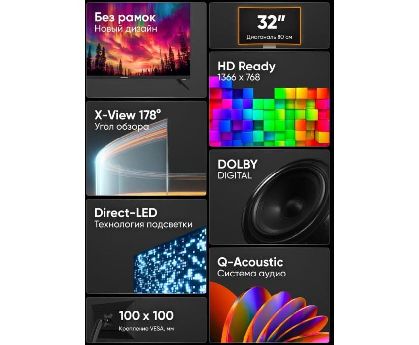 Диагональ дисплея 31.5" (80 см). Разрешение 1366 x 768. Тип экрана Безрамочный. Яркость (кд/м2) 250. Контраст 5000:1. Время отклика (мс) 7. Формат 16:9. Углы обзора (верт. х гориз.) 176 x 176. Поверхность Глянцевая. Стандарт вещания DVB-T / DVB-T2 / DVB-C / Аналоговый. Системы звука BG / DK / I. Система цветности PAL / SECAM. Количество каналов 99 аналоговых, 700 цифровых. HDMI 2 шт. / (1.4). HDMI функции CEC / ARC / HDCP (1.4). Встроенный порт USB 2 шт. / (2.0). CI порт CI+ (1.4). Выходы наушники (3,5мм) / оптический аудиовыход (Toslink). Входы композитный видеовход (RCA) / стерео аудиовход (RCA) / компонентный YPbPr (3,5мм). Питание ~110-240 В. Настенное крепление VESA 100 x 100. Мощность динамиков 2x8 Вт. Цвет Черный. Размер 728 х 478 х 194 с подставкой, 728 х 430 х 86 без подставки. Вес 4.2 кг.