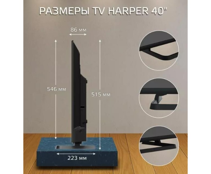 "40"" (101см),Frameless,FULL HD Bluetooth 5.0 Sber/voice assistant Android 11, 1-8G. Системы цветности аналогового ТВ: SECAM, PAL Цифровой тюнер DVB-T/T2/C SMART-TV WI-FI Декодеры стереозвука NICAM, А2 Формат изображения: 16:9 Разрешение экрана 1920х1080 Контрастность 5000:1 Яркость 240 кд/м2 Угол обзора (гор/верт) 178°/178° Цифровой 3D фильтр Количество цветов 16,7 млн. Время отклика 8 мс Меню на русском, английском языках Телетекст Аудио 2 х 8 Вт Входы/выходы: Антенный вход Композитный AV вход mini 3 х HDMI 2 х USB Аудио выход 3,5мм CI слот SPDIF (СОАХ) Питание: Напряжение 1ОО-240В 50/60Гц Максимальная потребляемая мощность 70 Вт Потребляемая мощность в режиме ожидания - 0,5 Вт Удельная мощность рабочего режима: 0,016 Вт/кв.см Потребляемая мощность в вы- ключенном режиме: О Вт Размеры с подставкой: 900x569x179 мм Размеры без подставки: 898x515x86 мм Вес: 5,8 кг VESA: 200х200 мм"