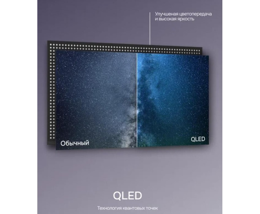 Диагональ (дюйм): 50. Диагональ (см): 127. Разрешение экрана: 3840x2160 (Ultra HD). QLED, SMART. Операционная система: Android Open Source Project (AOSP) . Версия операционной системы: Android 11.0. DVB-T2. DVB-S2. DVB-C. Wi-Fi 5.0. LAN. Наличие Bluetooth, голосовой поиск. Ci слот (шт): 1. USB-порт (шт): 2. HDMI (шт): 3. Оперативная память (Гб): 1,5. Встроенная память (Гб): 16